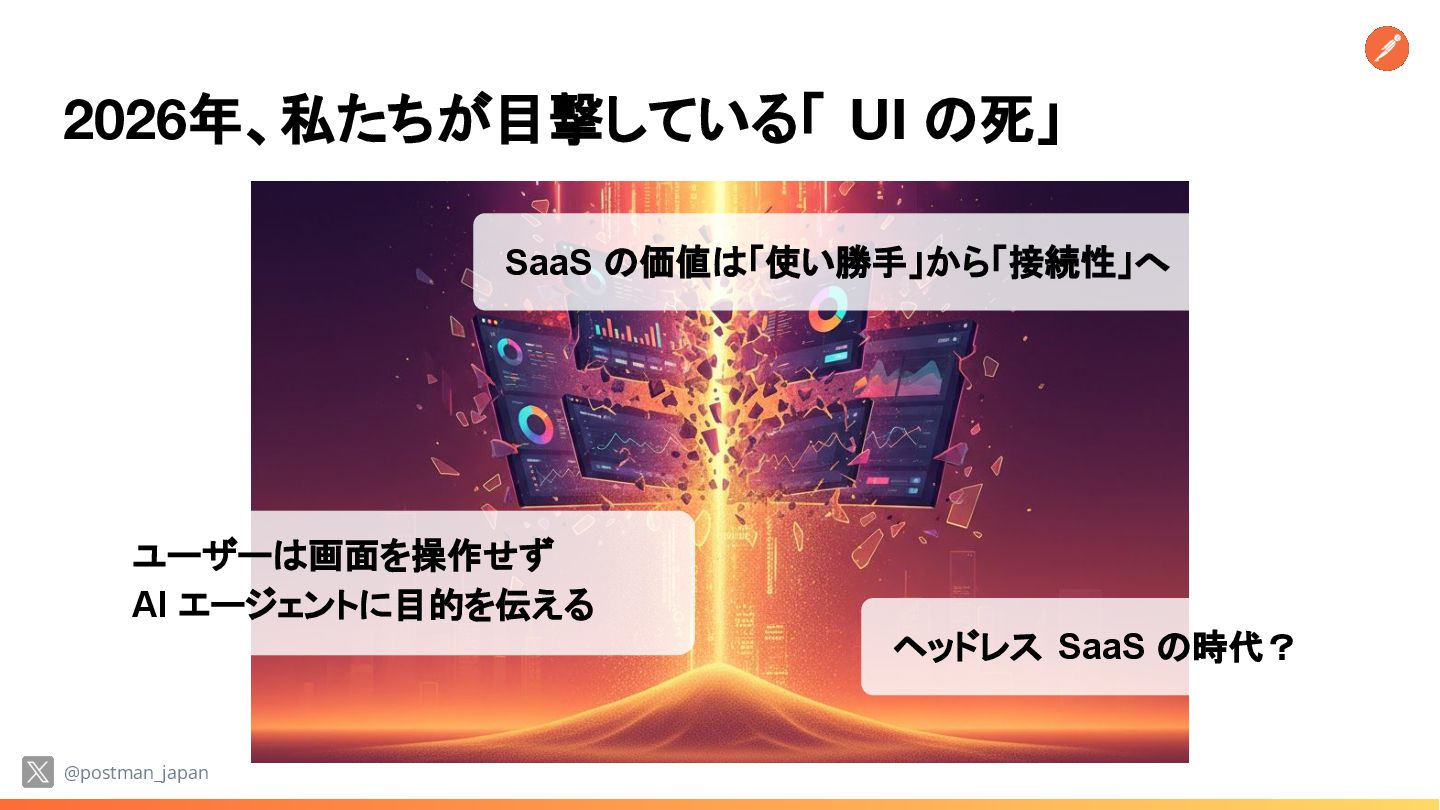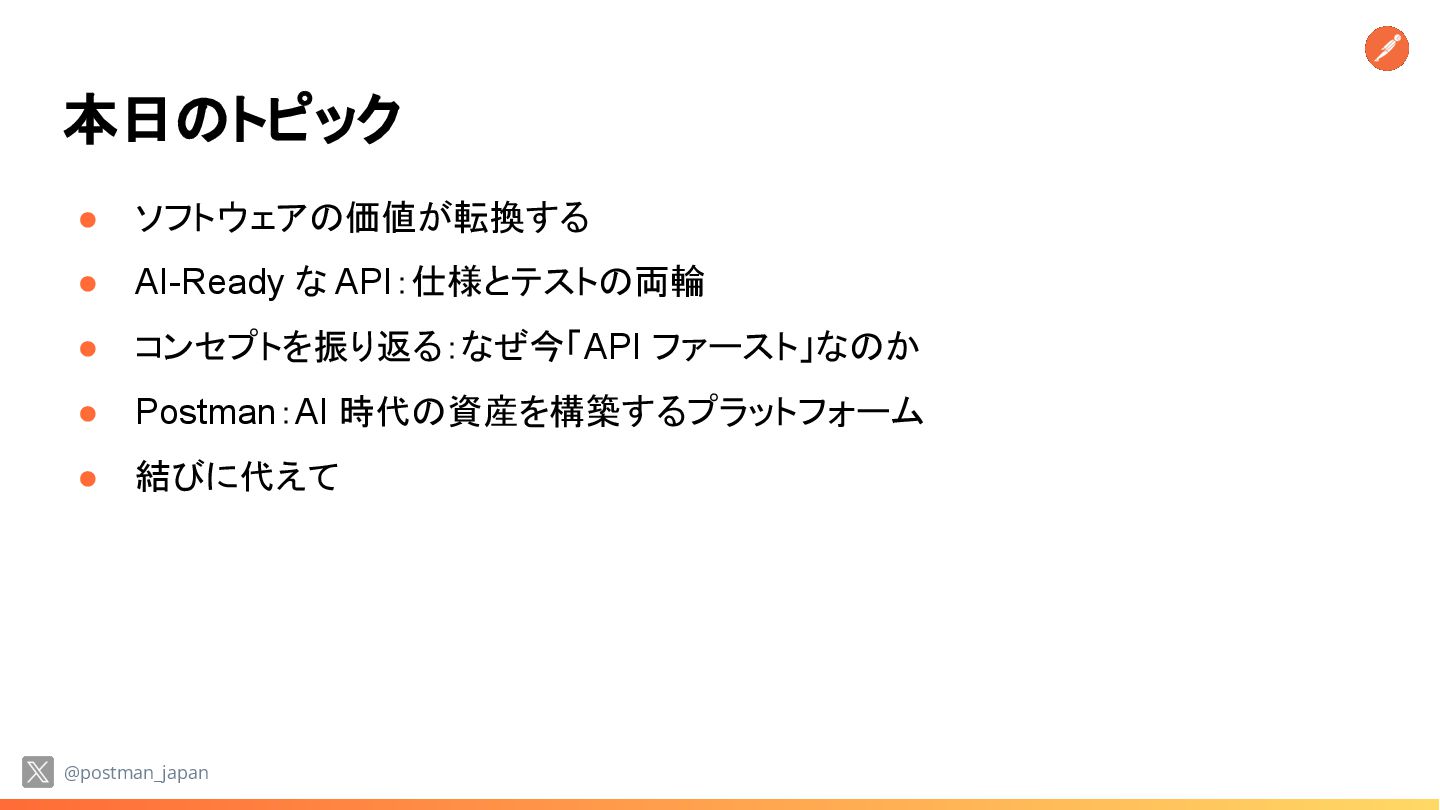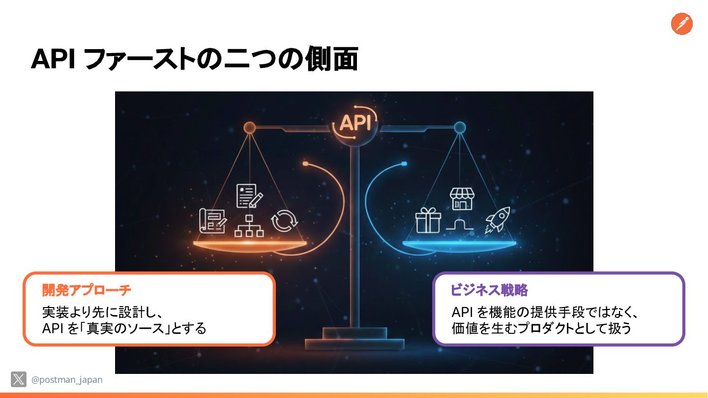 API が使いにくい=プロダクトが存 在しないのと同じ ◦ API を製品として磨くことが、AI 時 代のマーケティングであり、ビジネス 戦略になる @postman_japan