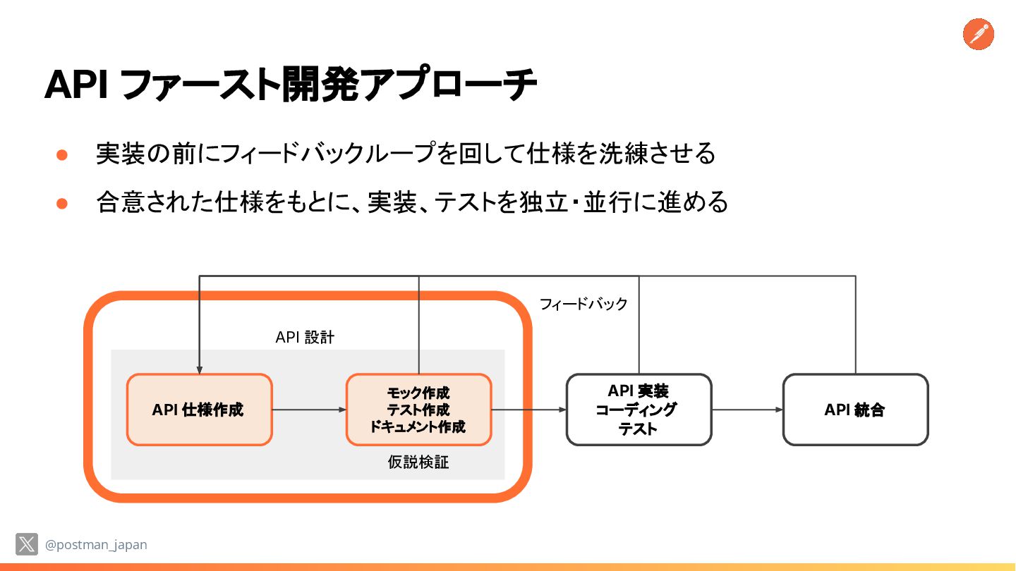 統合 フィードバック 仮説検証 API 設計 API ファースト開発アプローチ • 実装の前にフィードバックループを回して仕様を洗練させる • 合意された仕様をもとに、実装、テストを独立・並行に進める @postman_japan