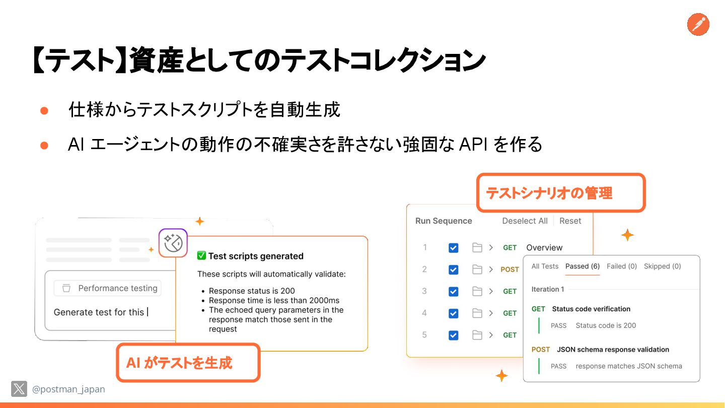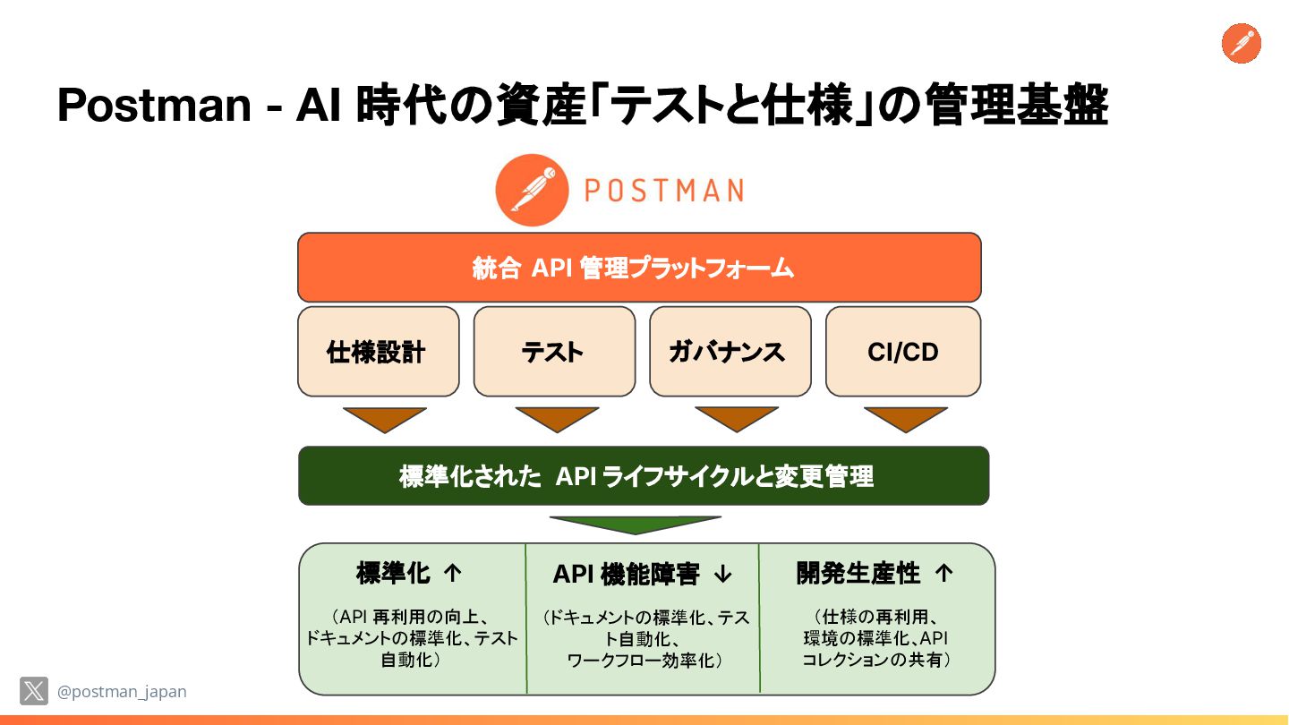 9. Postman - AI 時代の資産「テストと仕様」の管理基盤 @postman_japan 標準化 ↑ (API 再利用の向上、 ドキュメントの標準化、テスト