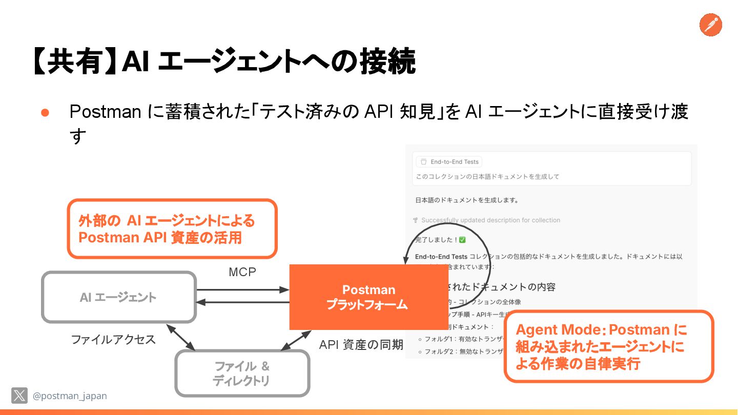 @postman_japan Agent Mode:Postman に 組み込まれたエージェントに よる作業の自律実行 Postman プラットフォーム AI エージェント MCP 外部の AI エージェントによる Postman API 資産の活用 ファイル & ディレクトリ ファイルアクセス API 資産の同期