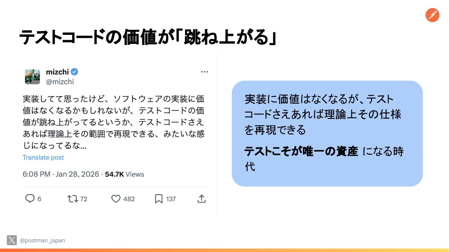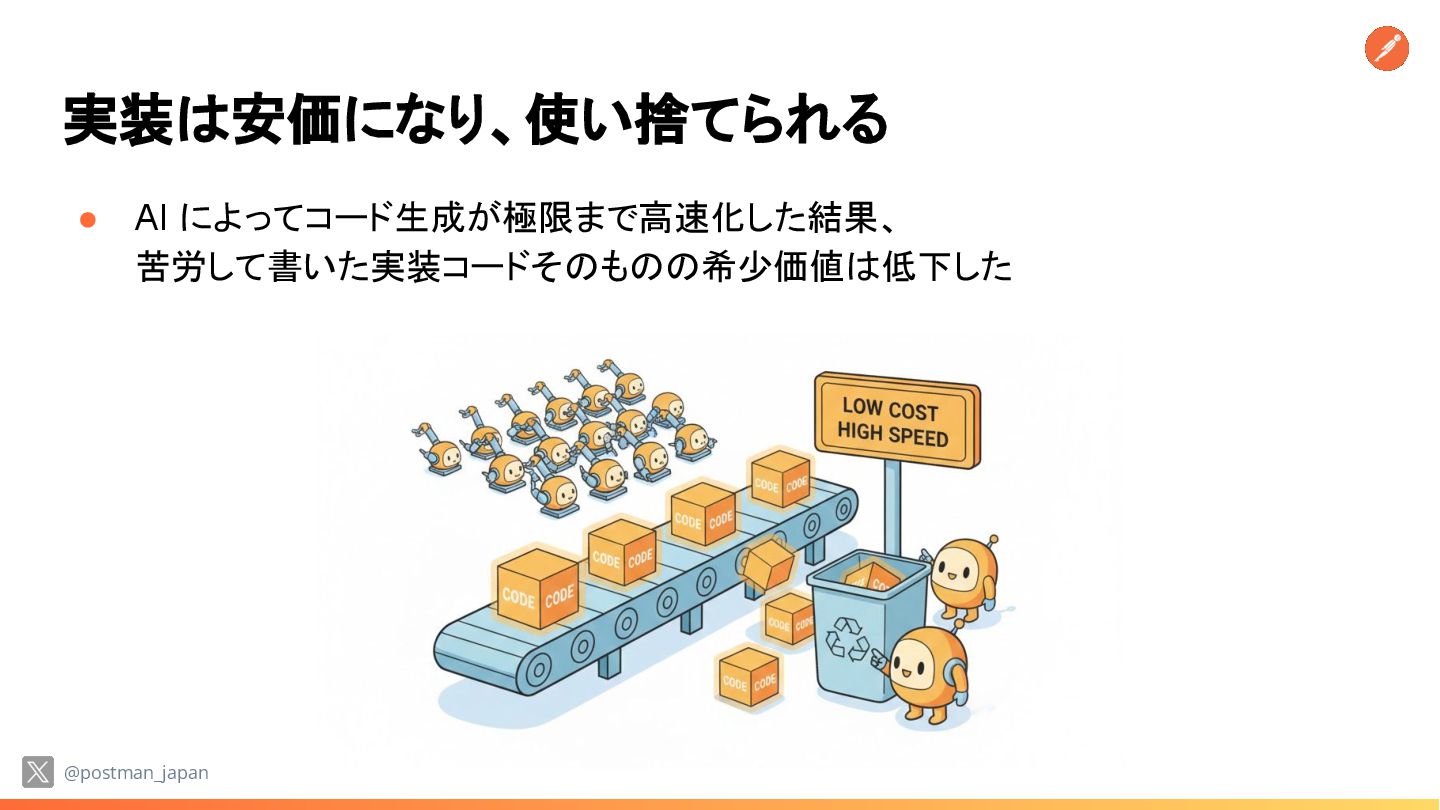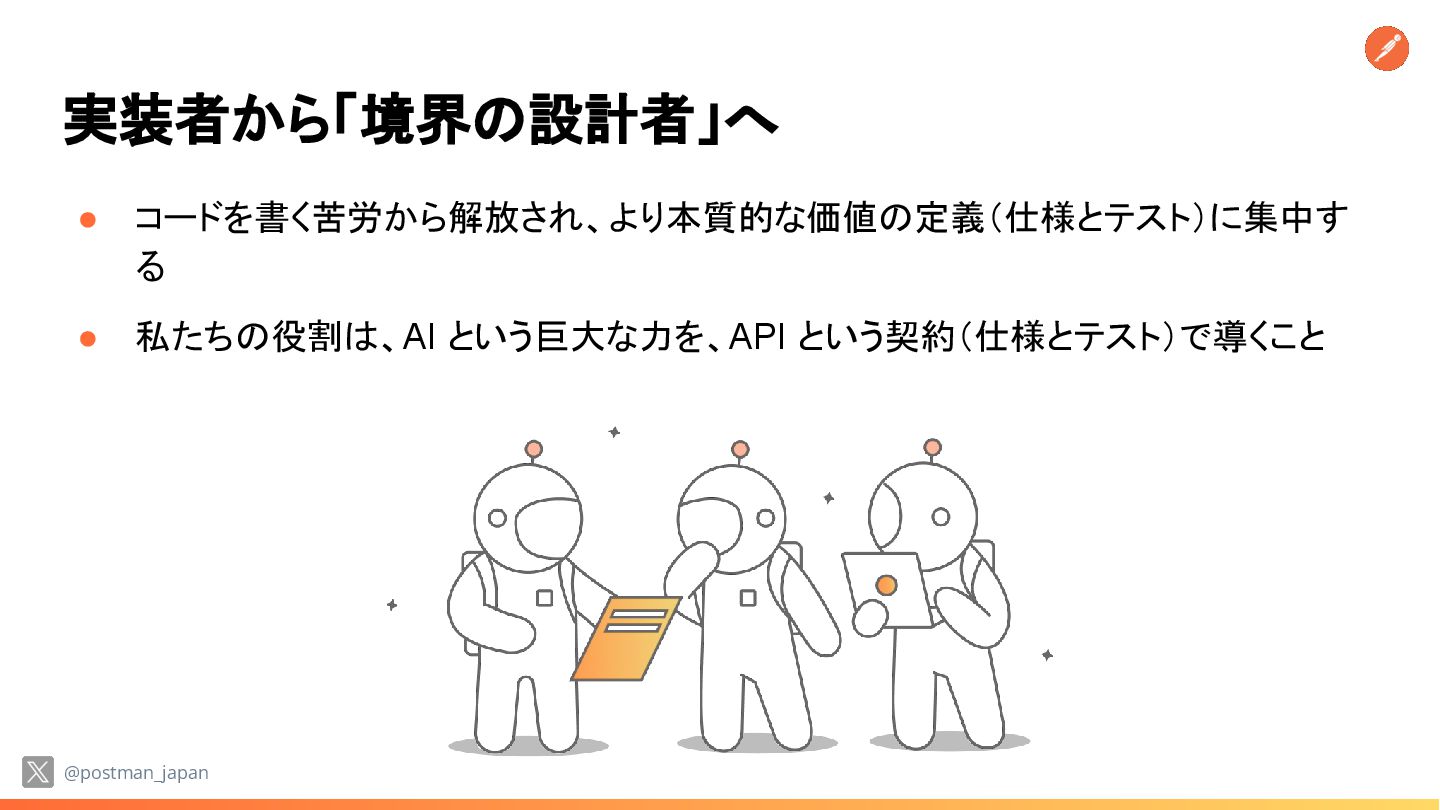 • AI は API を部品として扱うことで、コンテキス トウィンドウの制約を回避し、より複雑なシステ ムの構築が可能になる • 開発者の仕事は低レイヤーの実装から高レイ ヤーの境界設計へシフトする @postman_japan 境界としての API 複雑なサービス実装 AI の意図 AI エージェント or AI 生成実装
