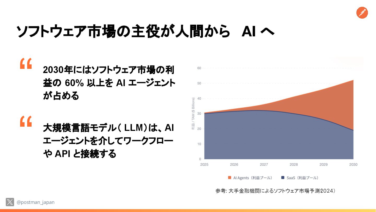 @postman_japan 参考: 大手金融機関によるソフトウェア市場予測( 2024) “ “ 大規模言語モデル( LLM)は、AI エージェントを介してワークフロー や API と接続する