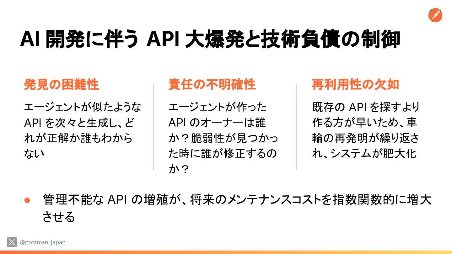 発見の困難性 エージェントが似たような API を次々と生成し、ど れが正解か誰もわから ない 責任の不明確性 エージェントが作った API のオーナーは誰 か?脆弱性が見つかっ た時に誰が修正するの か? 再利用性の欠如 既存の API を探すより 作る方が早いため、車 輪の再発明が繰り返さ れ、システムが肥大化