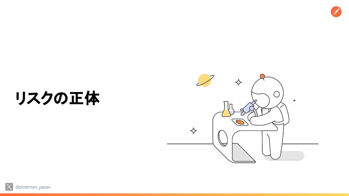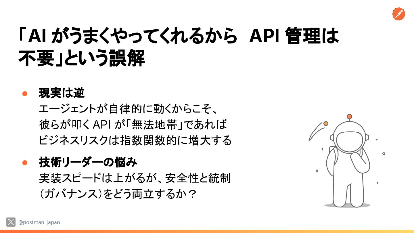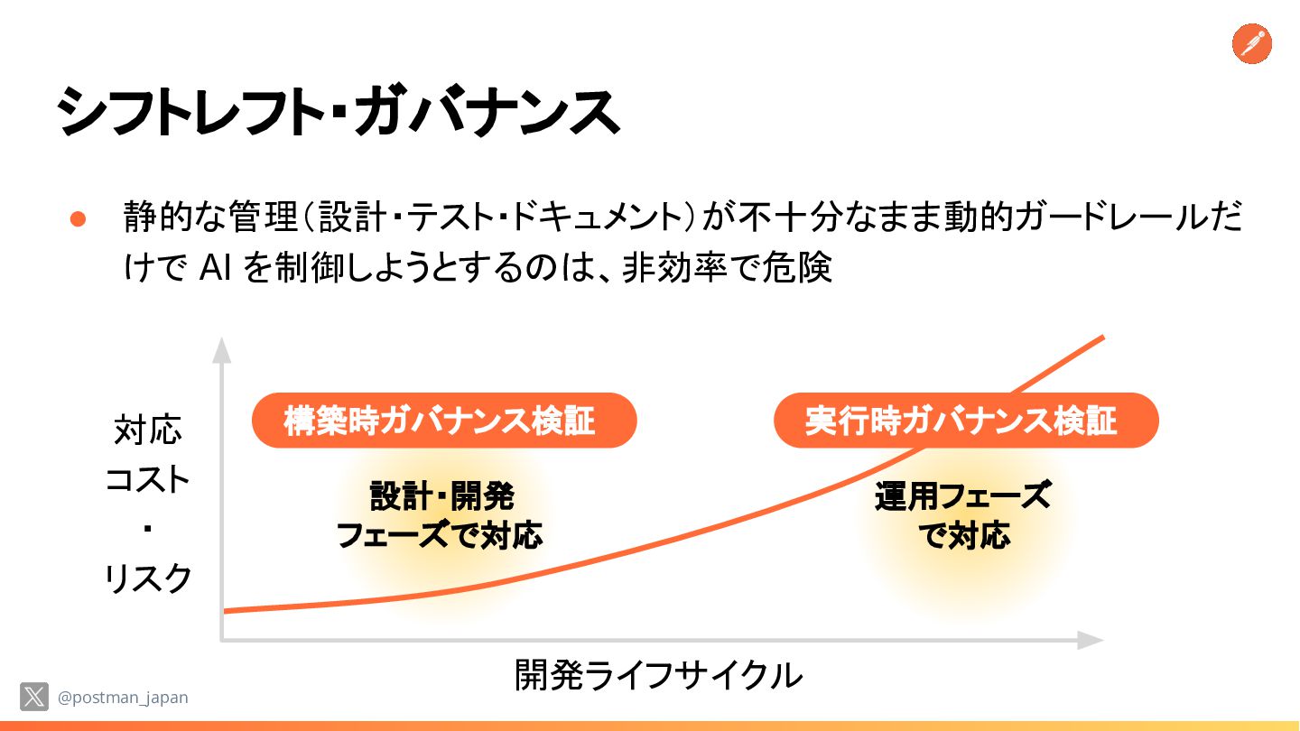 が「無法地帯」であれば ビジネスリスクは指数関数的に増大する • 技術リーダーの悩み 実装スピードは上がるが、安全性と統制 (ガバナンス)をどう両立するか? @postman_japan