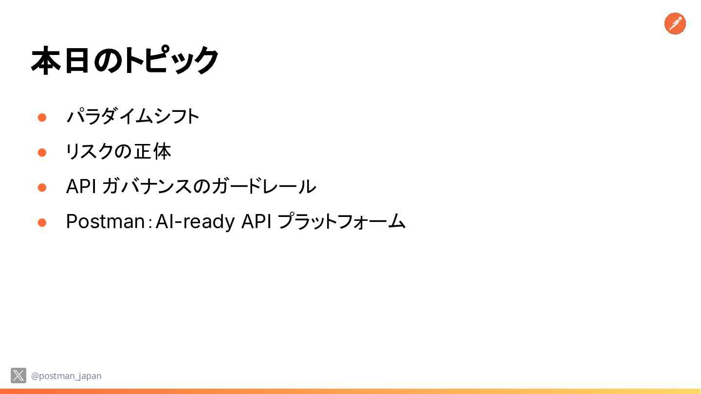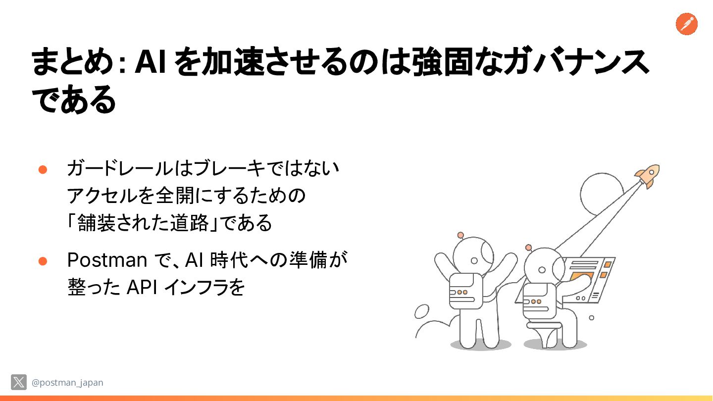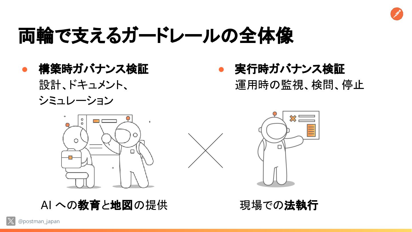 が「無法地帯」であれば ビジネスリスクは指数関数的に増大する • 技術リーダーの悩み 実装スピードは上がるが、安全性と統制 (ガバナンス)をどう両立するか? @postman_japan