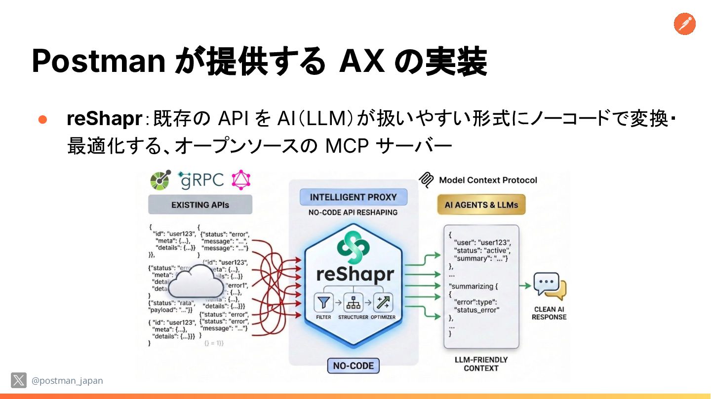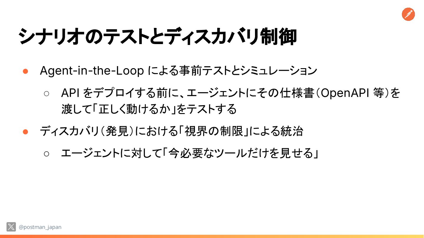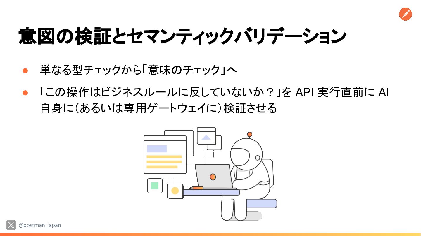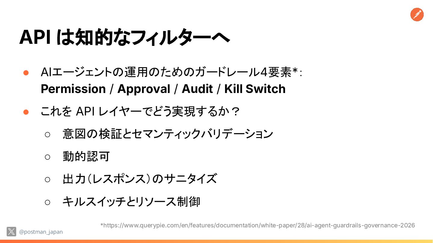 Kill Switch • これを API レイヤーでどう実現するか? ◦ 意図の検証とセマンティックバリデーション ◦ 動的認可 ◦ 出力(レスポンス)のサニタイズ ◦ キルスイッチとリソース制御 @postman_japan *https://www.querypie.com/en/features/documentation/white-paper/28/ai-agent-guardrails-governance-2026