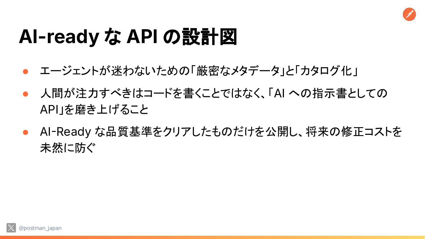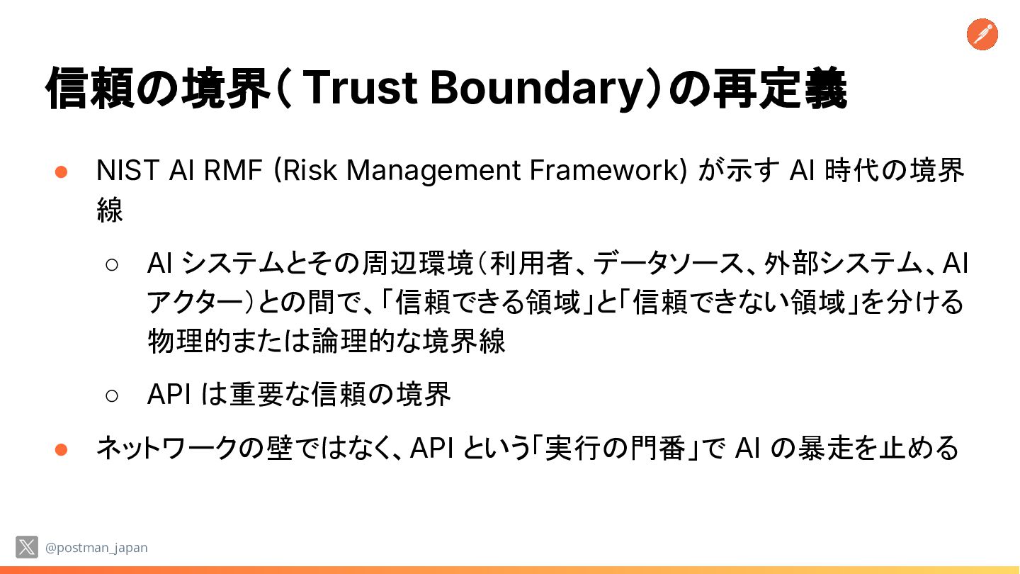 が示す AI 時代の境界 線 ◦ AI システムとその周辺環境(利用者、データソース、外部システム、AI アクター)との間で、「信頼できる領域」と「信頼できない領域」を分ける 物理的または論理的な境界線 ◦ API は重要な信頼の境界 • ネットワークの壁ではなく、API という「実行の門番」で AI の暴走を止める @postman_japan