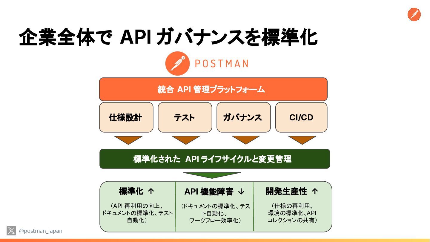 9. 企業全体で API ガバナンスを標準化 @postman_japan 標準化 ↑ (API 再利用の向上、 ドキュメントの標準化、テスト 自動化)