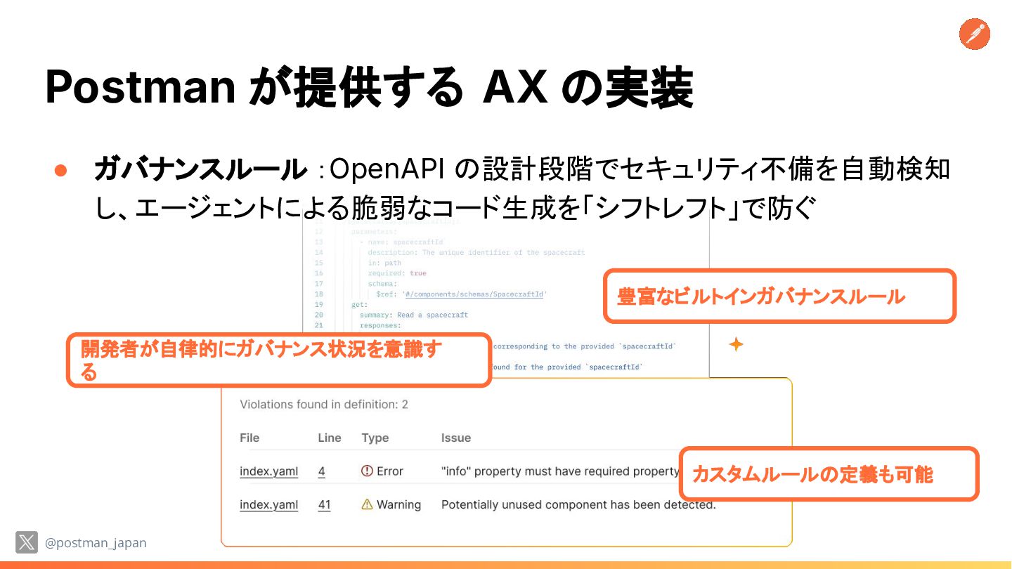 :OpenAPI の設計段階でセキュリティ不備を自動検知 し、エージェントによる脆弱なコード生成を「シフトレフト」で防ぐ @postman_japan