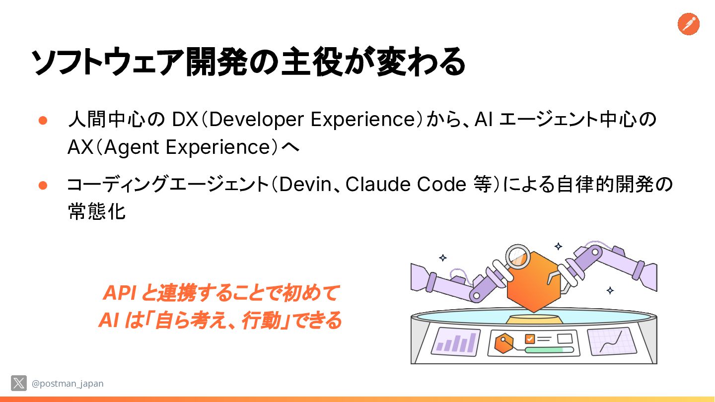Code 等)による自律的開発の 常態化 @postman_japan API と連携することで初めて AI は「自ら考え、行動」できる