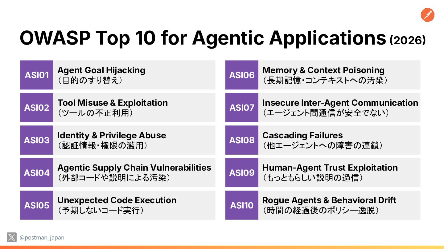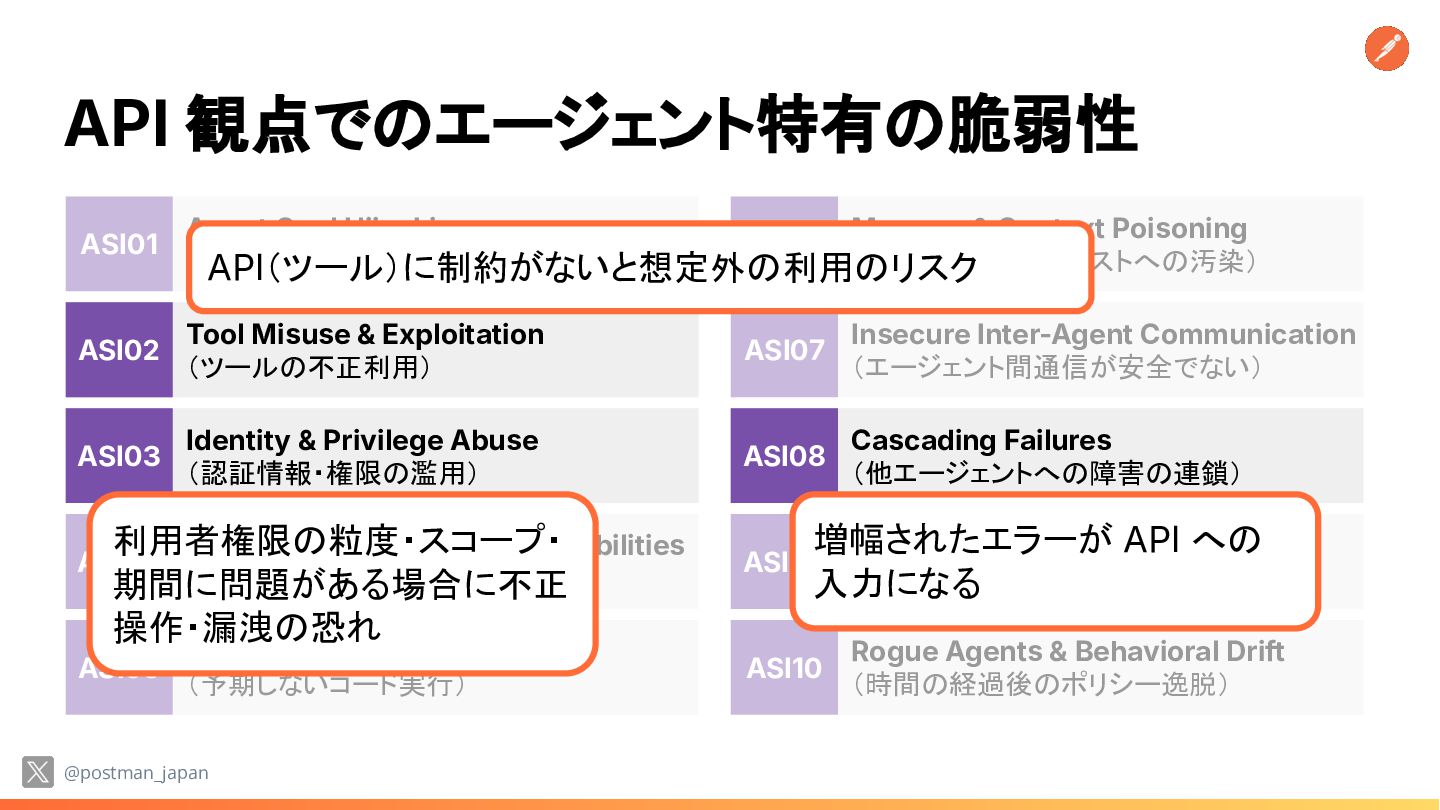 Tool Misuse & Exploitation (ツールの不正利用) ASI02 API 観点でのエージェント特有の脆弱性 @postman_japan Agent Goal Hijacking (目的のすり替え) Agentic Supply Chain Vulnerabilities (外部コードや説明による汚染) Unexpected Code Execution (予期しないコード実行) Memory & Context Poisoning (長期記憶・コンテキストへの汚染) Human-Agent Trust Exploitation (もっともらしい説明の過信) Insecure Inter-Agent Communication (エージェント間通信が安全でない) Rogue Agents & Behavioral Drift (時間の経過後のポリシー逸脱) ASI01 ASI04 ASI05 ASI06 ASI07 ASI09 ASI10 Tool Misuse & Exploitation (ツールの不正利用) Identity & Privilege Abuse (認証情報・権限の濫用) ASI02 ASI03 Cascading Failures (他エージェントへの障害の連鎖) ASI08 API(ツール)に制約がないと想定外の利用のリスク 利用者権限の粒度・スコープ・ 期間に問題がある場合に不正 操作・漏洩の恐れ 増幅されたエラーが API への 入力になる