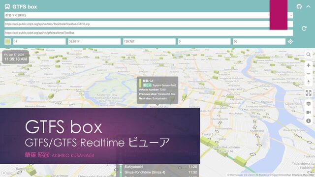 GTFS boxは、世界中の公共交通機関のリアルタイムの運行の様子を3Dマップ上で見ることができる、GTFS/GTFS Realtimeビューアです。Mini Tokyo 3Dをライブラリとして使用したWebアプリケーションであり、滑らかな動作とリアルな風景が特徴です。