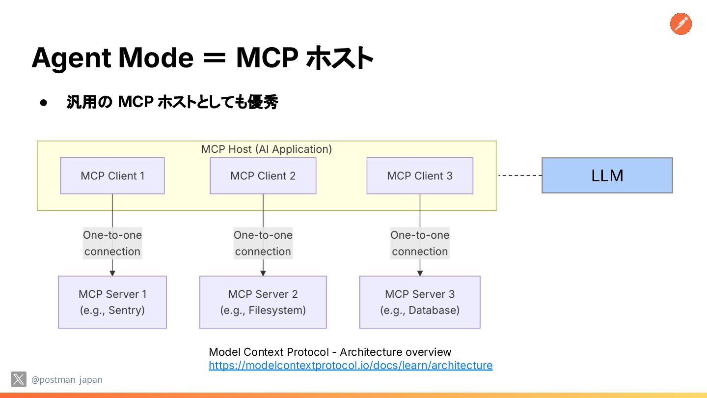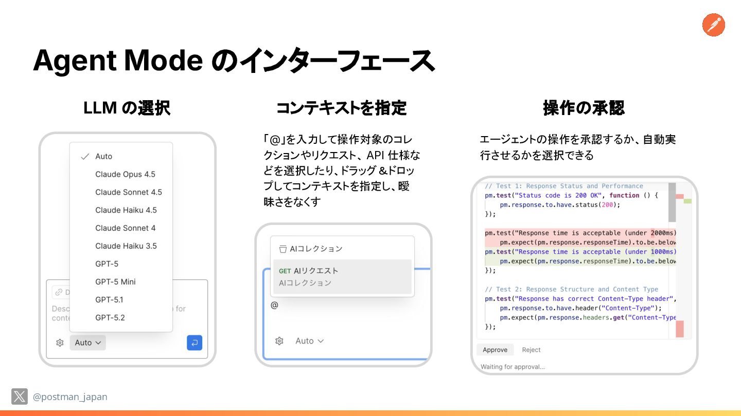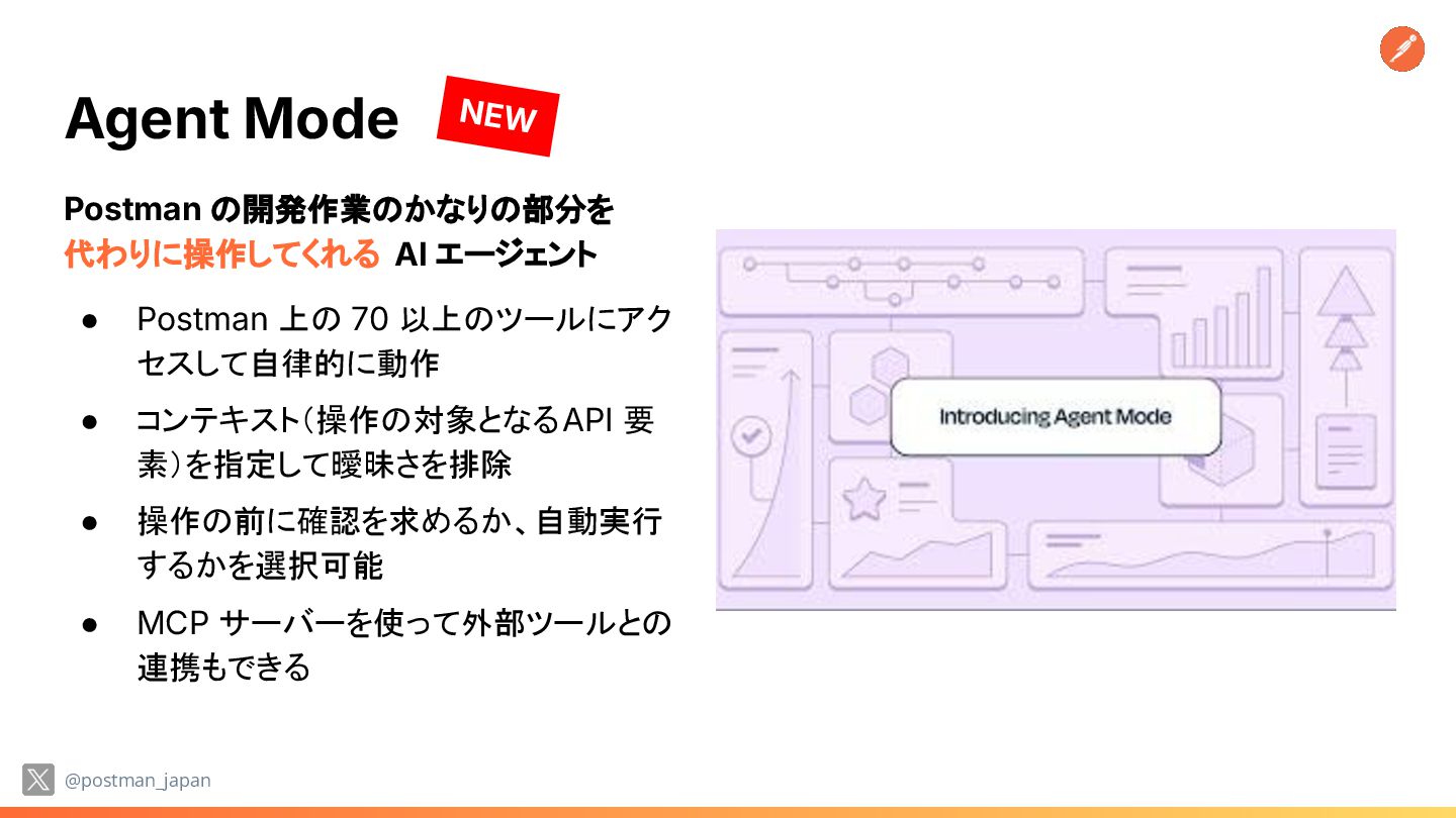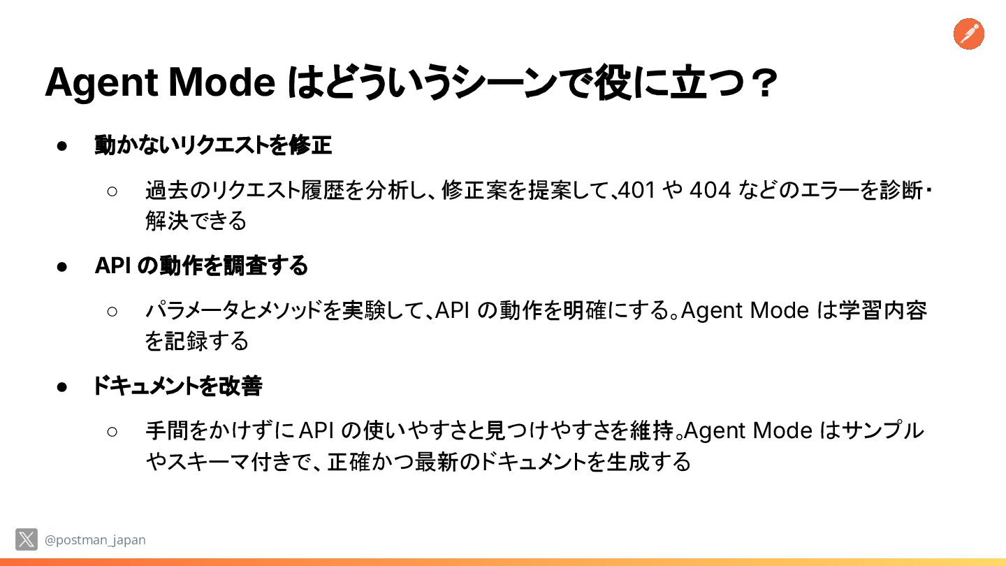2025年10月に公開ベータリリースされた、Postmanの新しいAIエージェント機能Agent Modeは、従来のAIアシスタントの枠を超え、幅広いAPI開発作業をまさにエージェントとしてAIに任せられる新機能です。Agent Modeの概要、使い方から、MCPを介した外部連携、定型タスクをまとめたスキル、MCP-UIによるUIコンポーネントの埋め込みまで、Agent Modeの魅力を余すところなく紹介します。Postman API Night Okinawa 2026 Winterでの発表資料です。