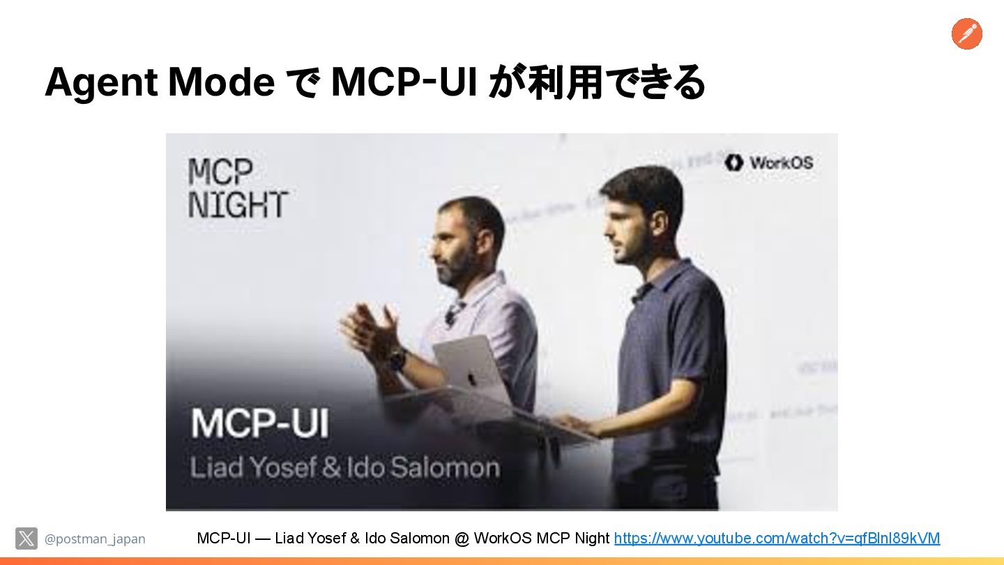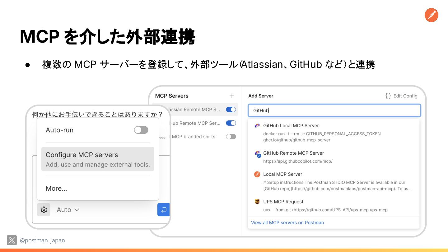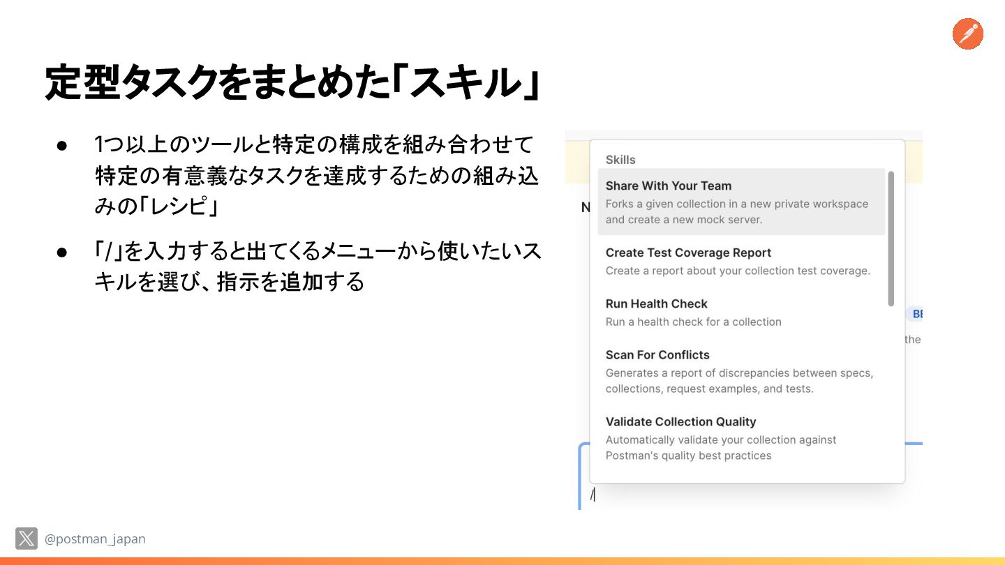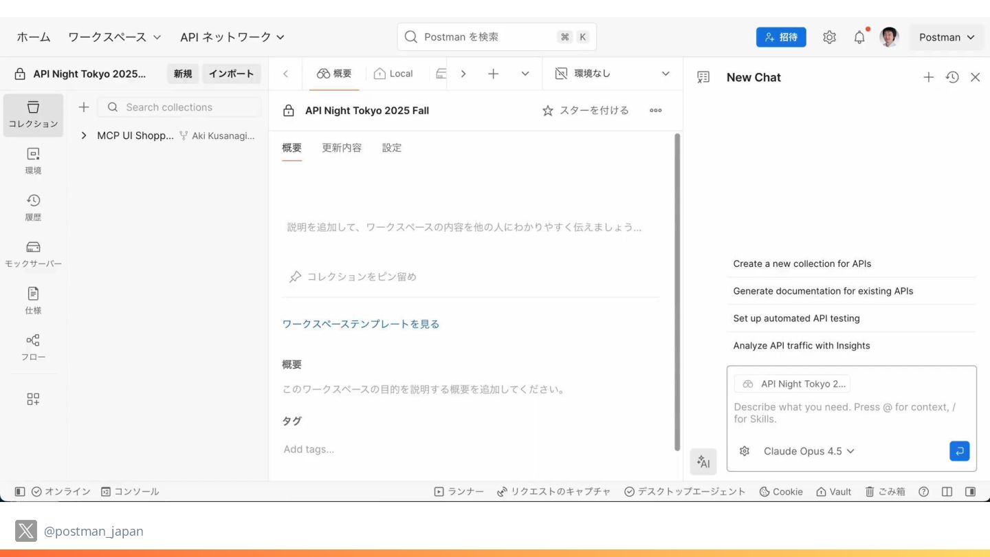 2025年10月に公開ベータリリースされた、Postmanの新しいAIエージェント機能Agent Modeは、従来のAIアシスタントの枠を超え、幅広いAPI開発作業をまさにエージェントとしてAIに任せられる新機能です。Agent Modeの概要、使い方から、MCPを介した外部連携、定型タスクをまとめたスキル、MCP-UIによるUIコンポーネントの埋め込みまで、Agent Modeの魅力を余すところなく紹介します。Postman API Night Okinawa 2026 Winterでの発表資料です。