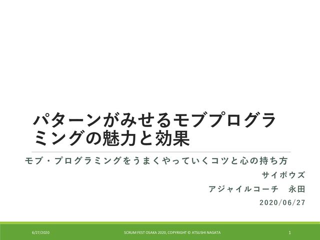 モブ・プログラミングのコツ 6/27/2020 SCRUM FEST OSAKA 2020, COPYRIGHT © ATSUSHI NAGATA