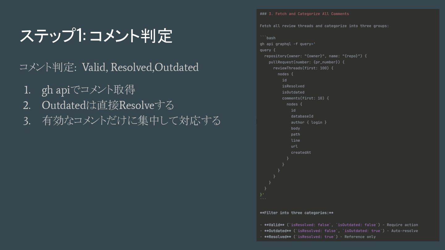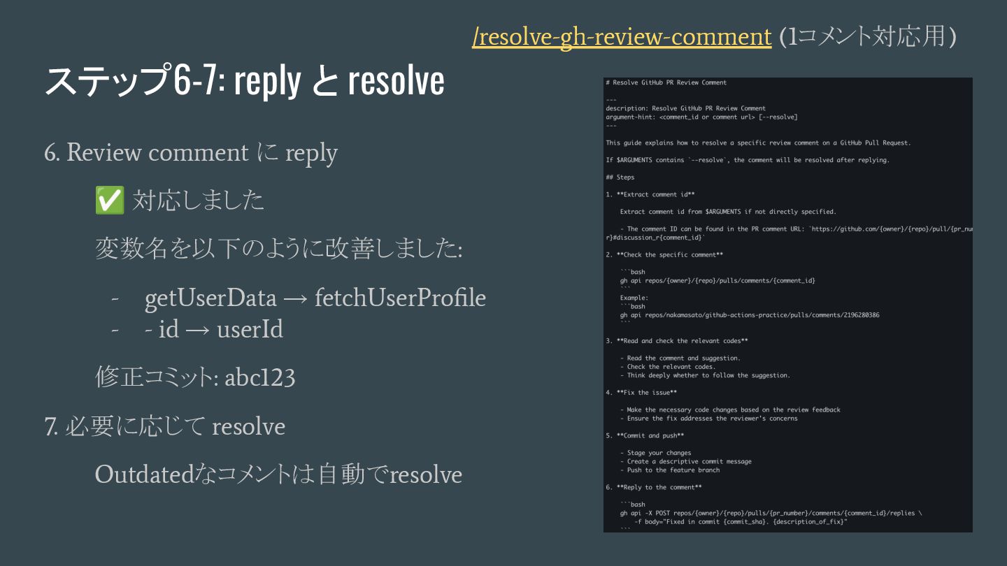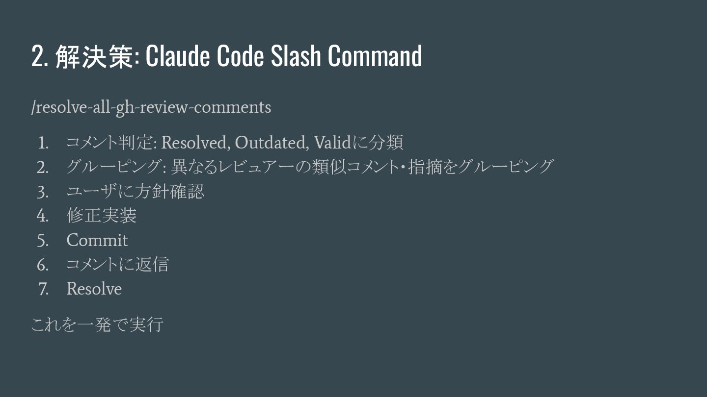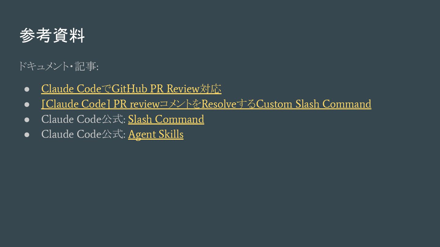 - [Claude Code] AIコーディング開発サイクル (2025年11月時点) - [Claude Code] PRのレビューを確認して返信・ResolveするSlash Command /check-gh-review-comments - [Claude Code] PR reviewコメントをResolveするCustom Slash Command - https://code.claude.com/docs/en/slash-commands