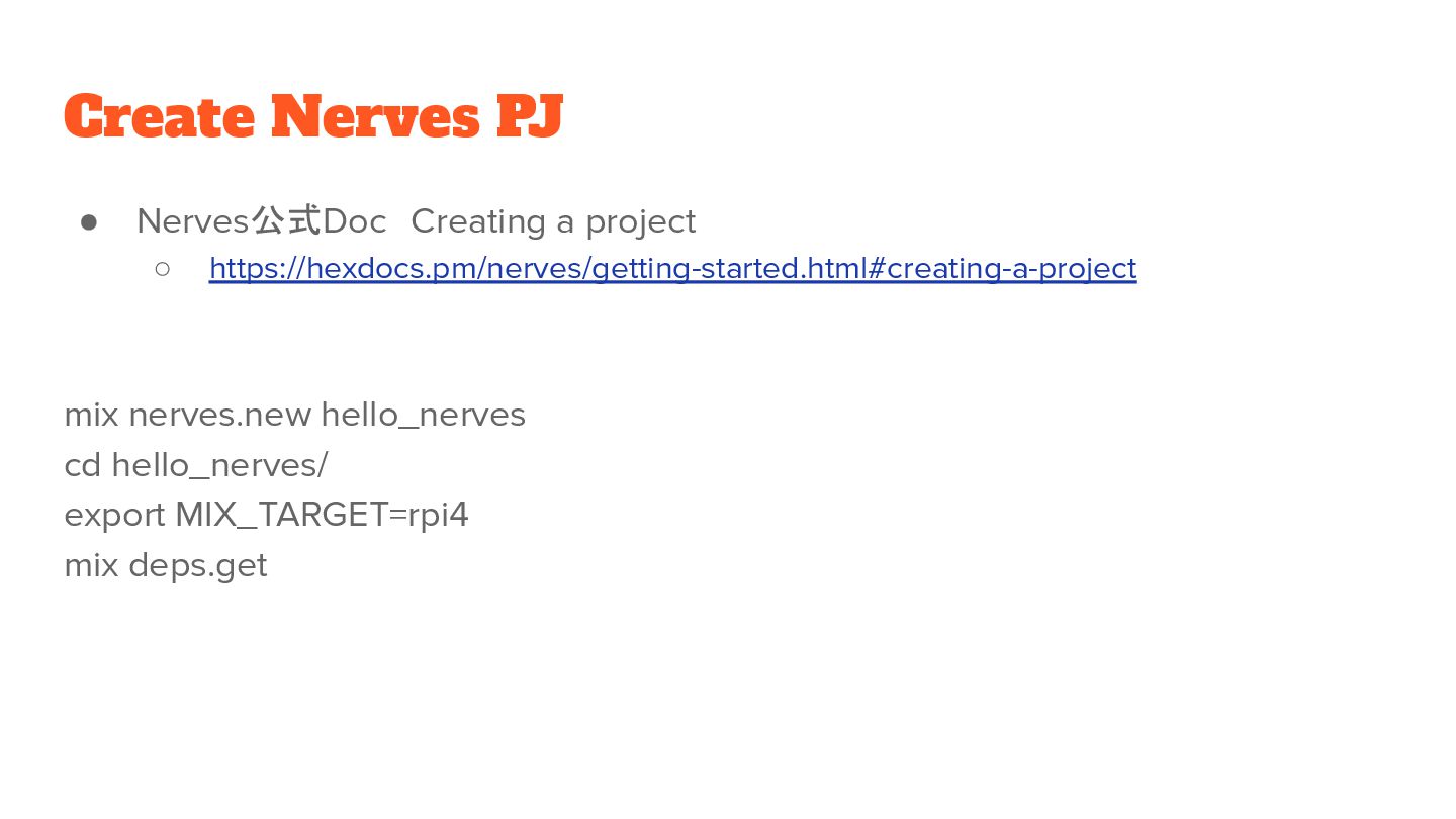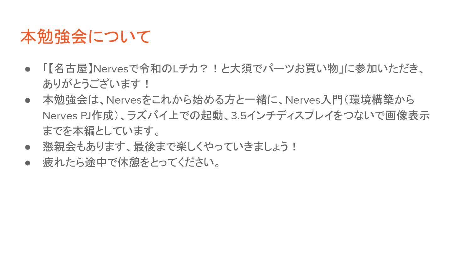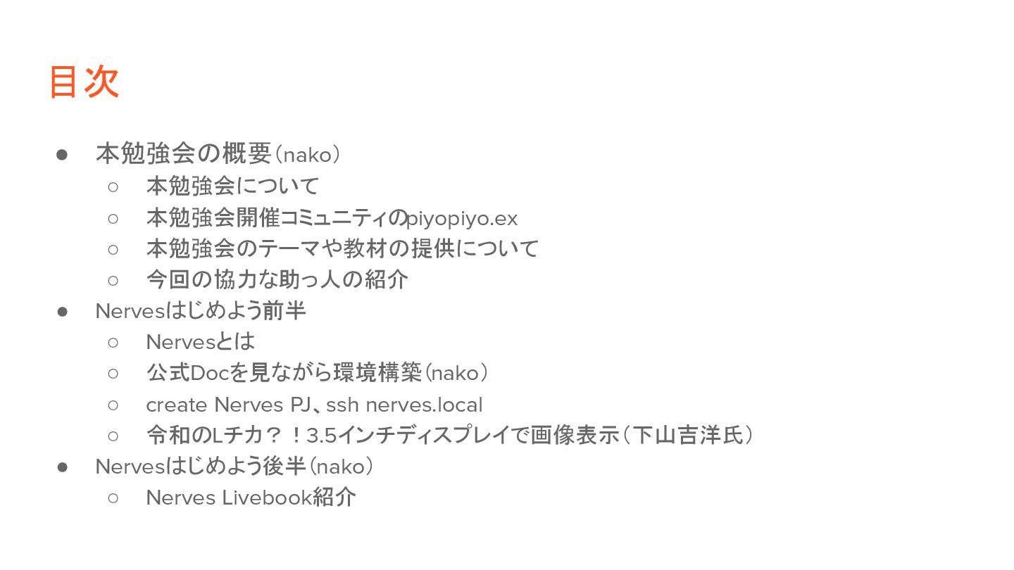 今回の協力な助っ人の紹介 • Nervesはじめよう前半 ◦ Nervesとは ◦ 公式Docを見ながら環境構築(nako) ◦ create Nerves PJ、ssh nerves.local ◦ 令和のLチカ?!3.5インチディスプレイで画像表示(下山吉洋氏) • Nervesはじめよう後半(nako) ◦ Nerves Livebook紹介