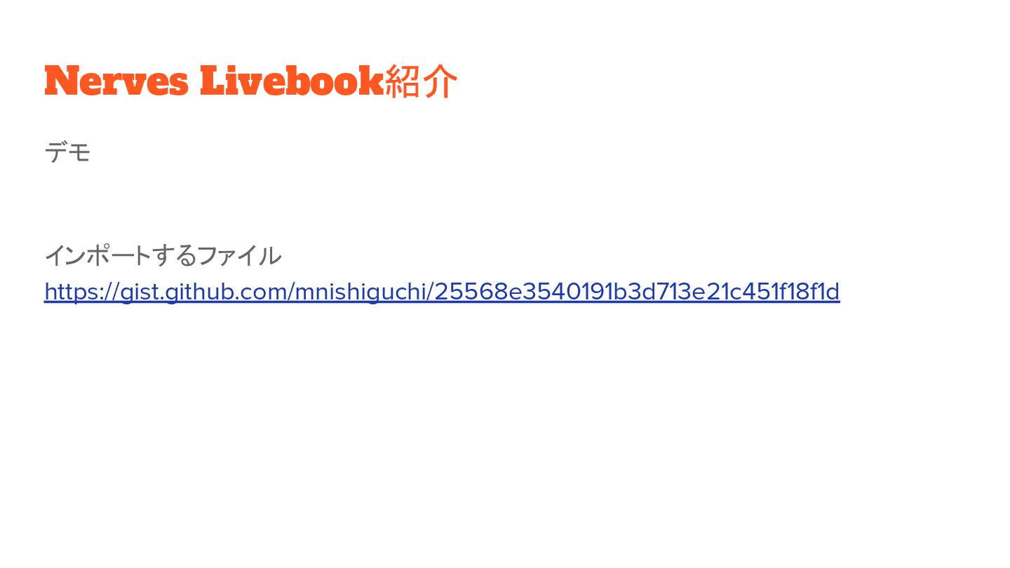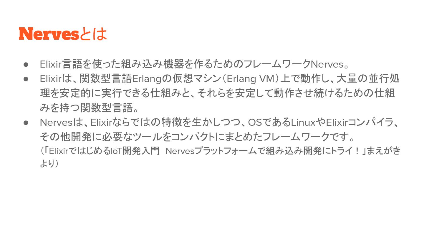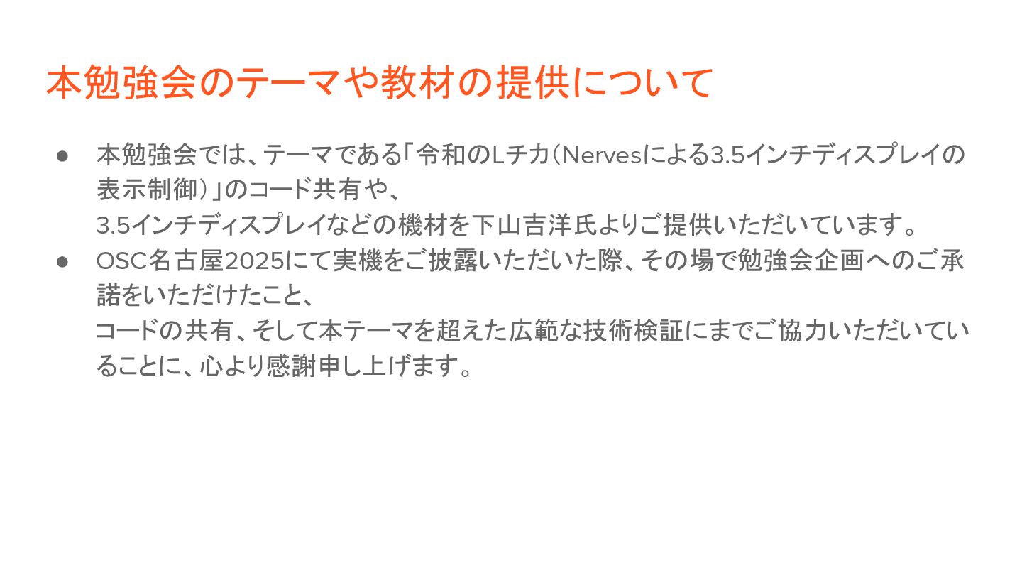 今回の協力な助っ人の紹介 • Nervesはじめよう前半 ◦ Nervesとは ◦ 公式Docを見ながら環境構築(nako) ◦ create Nerves PJ、ssh nerves.local ◦ 令和のLチカ?!3.5インチディスプレイで画像表示(下山吉洋氏) • Nervesはじめよう後半(nako) ◦ Nerves Livebook紹介