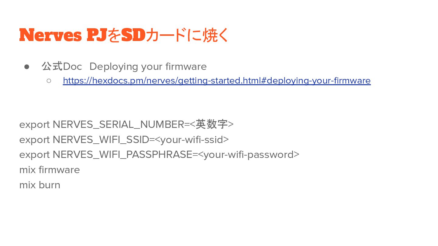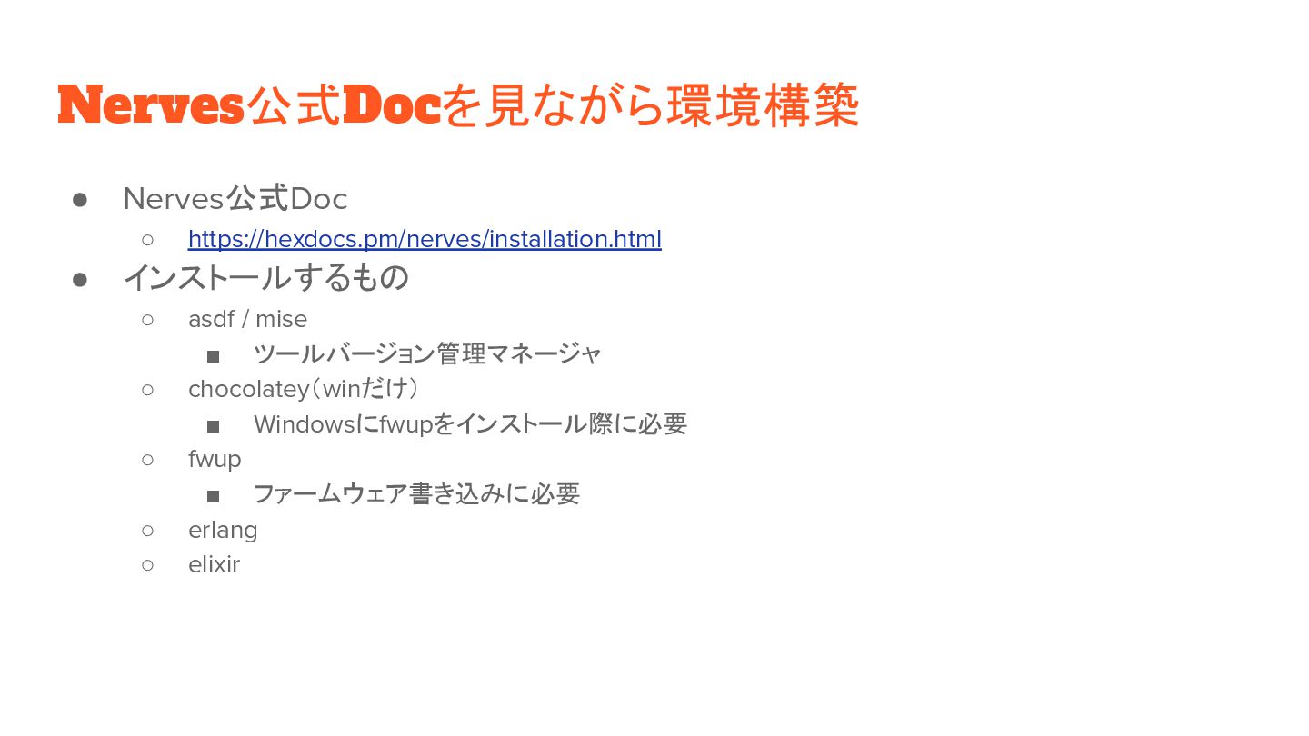 3. Nerves公式Docを見ながら環境構築 • Nerves公式Doc ◦ https://hexdocs.pm/nerves/installation.html • インストールするもの ◦ asdf /