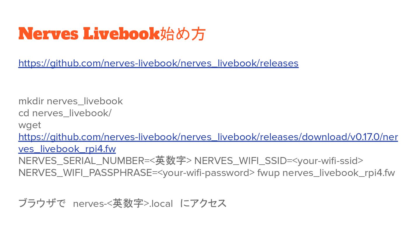 5. Nerves Livebook始め方 https://github.com/nerves-livebook/nerves_livebook/releases mkdir nerves_livebook cd nerves_livebook/ wget https://github.com/nerves-livebook/nerves_livebook/releases/download/v0.17.0/ner ves_livebook_rpi4.fw