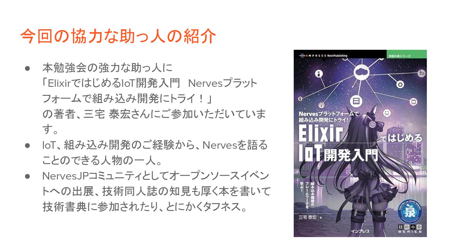 2. 今回の協力な助っ人の紹介 • 本勉強会の強力な助っ人に 「ElixirではじめるIoT開発入門 Nervesプラット フォームで組み込み開発にトライ!」 の著者、三宅 泰宏さんにご参加いただいていま す。 • IoT、組み込み開発のご経験から、Nervesを語る