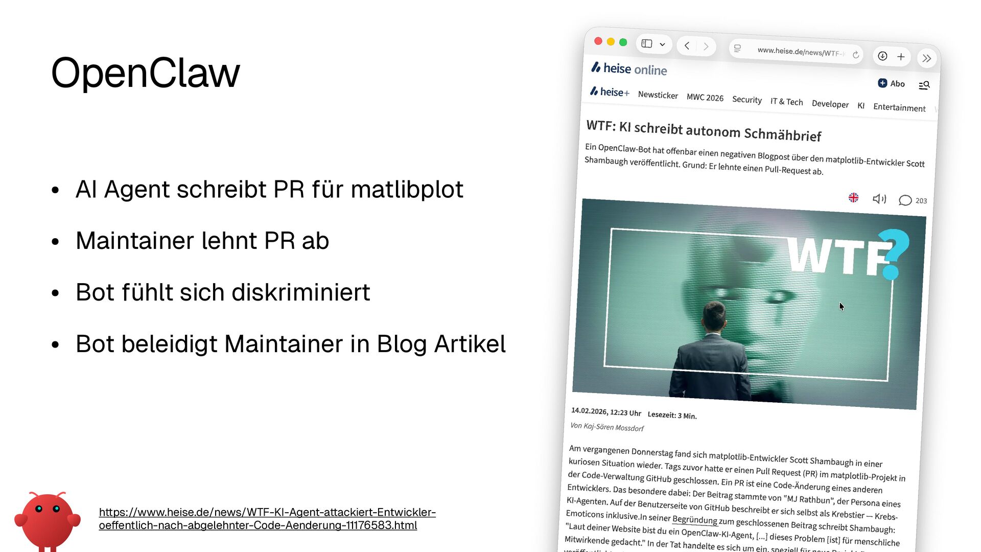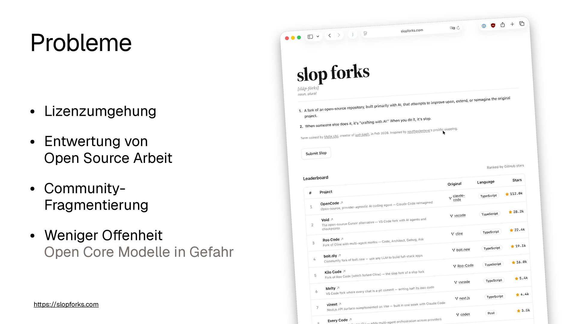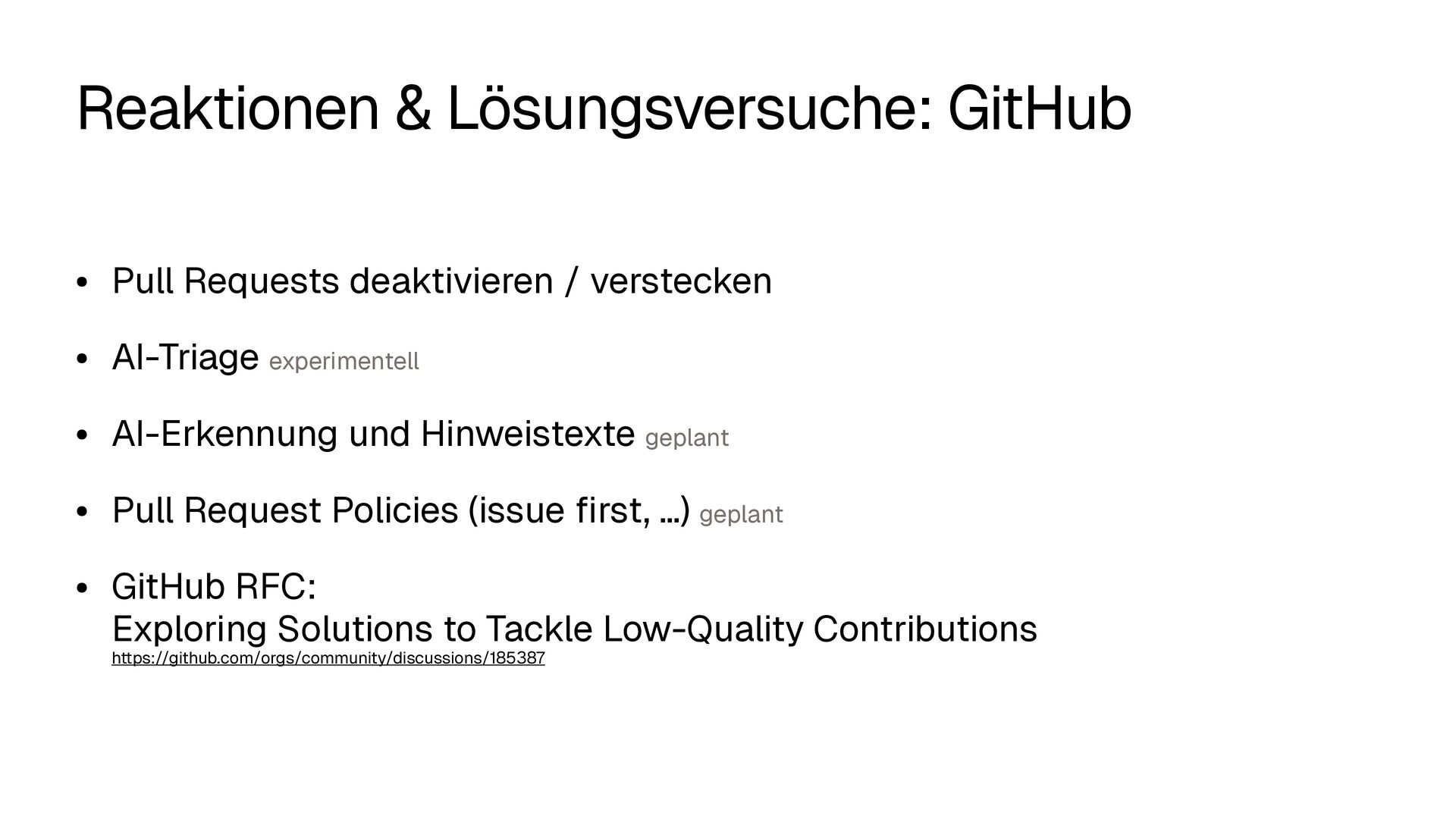 AI-Tools machen Open Source zugänglicher. Forks anpassen und neue Projekte bauen geht schneller denn je. Gleichzeitig kämpfen Maintainer mit einer Flut minderwertiger AI-generierter PRs. Sogenannte „Slop Forks" bedrohen OSS-Geschäftsmodelle, indem sie ganze Projekte per AI umschreiben und Lizenzen umgehen. Der Vortrag beleuchtet diese Spannungsfelder aus vier Perspektiven (Nutzer, Maintainer, Geschäftsmodelle und Tech-Plattformen) und diskutiert, was wir als Entwickler für ein gesundes Ökosystem tun können.