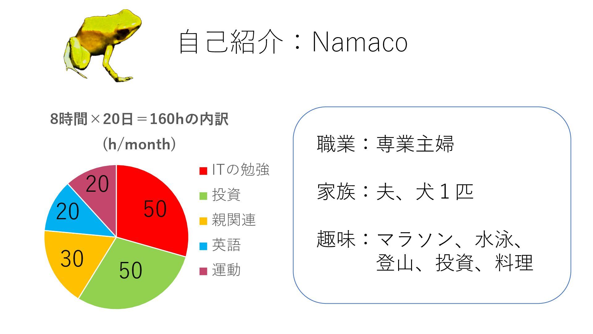 ⾃⼰紹介:Namaco 職業:専業主婦 家族:夫、⽝1匹 趣味:マラソン、⽔泳、 登⼭、投資、料理 50 50 30 20 20