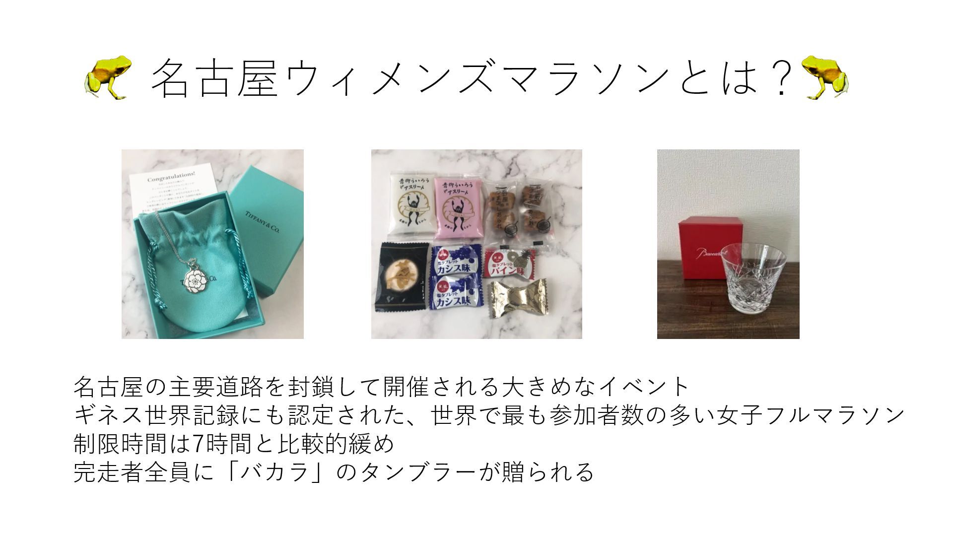 名古屋ウィメンズマラソンとは? 名古屋の主要道路を封鎖して開催される⼤きめなイベント ギネス世界記録にも認定された、世界で最も参加者数の多い⼥⼦フルマラソン 制限時間は7時間と⽐較的緩め 完⾛者全員に「バカラ」のタンブラーが贈られる