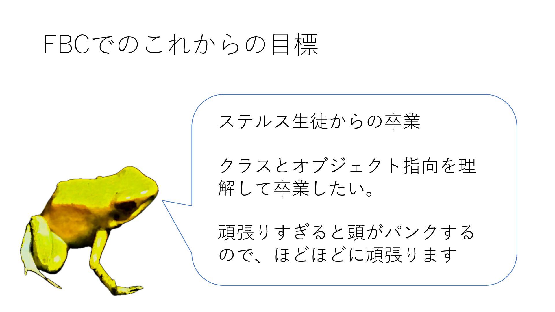 FBCでのこれからの⽬標 ステルス⽣徒からの卒業 クラスとオブジェクト指向を理 解して卒業したい。 頑張りすぎると頭がパンクする ので、ほどほどに頑張ります