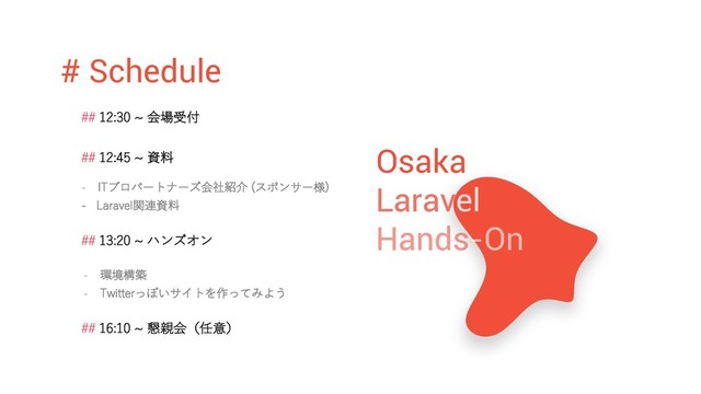 ## 16:10 ~ 懇親会(任意) ## 13:20 ~ ハンズオン - ITプロパートナーズ会社紹介 (スポンサー様) - Laravel関連資料 - 環境構築 - Twitterっぽいサイトを作ってみよう Osaka