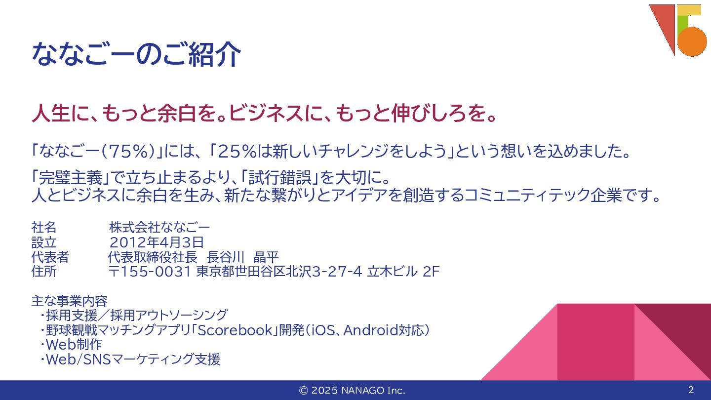 © 2025 NANAGO Inc. ななごーのご紹介 人生に、もっと余白を。ビジネスに、もっと伸びしろを。 「ななごー(75%)」には、 「25%は新しいチャレンジをしよう」という想いを込めました。 「完璧主義」で立ち止まるより、「試行錯誤」を大切に。 人とビジネスに余白を生み、新たな繋がりとアイデアを創造するコミュニティテック企業です。