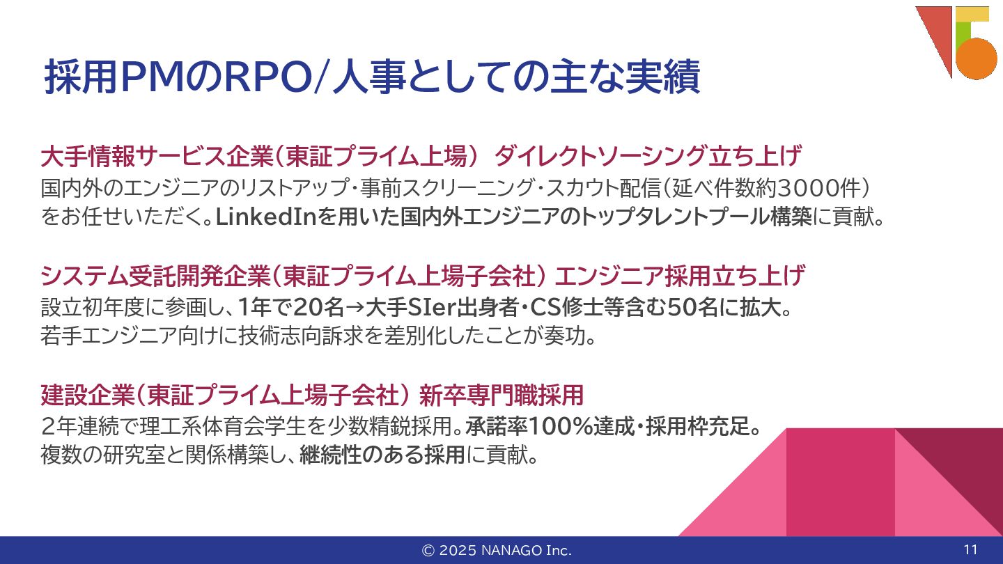 © 2025 NANAGO Inc. 採用PMのRPO/人事としての主な実績 11 大手情報サービス企業(東証プライム上場) ダイレクトソーシング立ち上げ 国内外のエンジニアのリストアップ・事前スクリーニング・スカウト配信(延べ件数約3000件) をお任せいただく。LinkedInを用いた国内外エンジニアのトップタレントプール構築に貢献。 システム受託開発企業(東証プライム上場子会社)