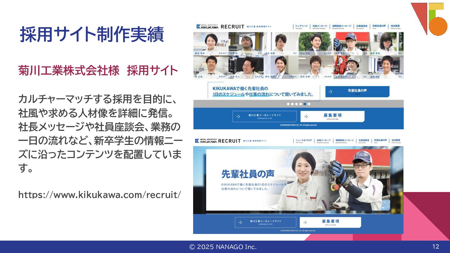 © 2025 NANAGO Inc. 採用サイト制作実績 12 菊川工業株式会社様 採用サイト カルチャーマッチする採用を目的に、 社風や求める人材像を詳細に発信。 社長メッセージや社員座談会、業務の