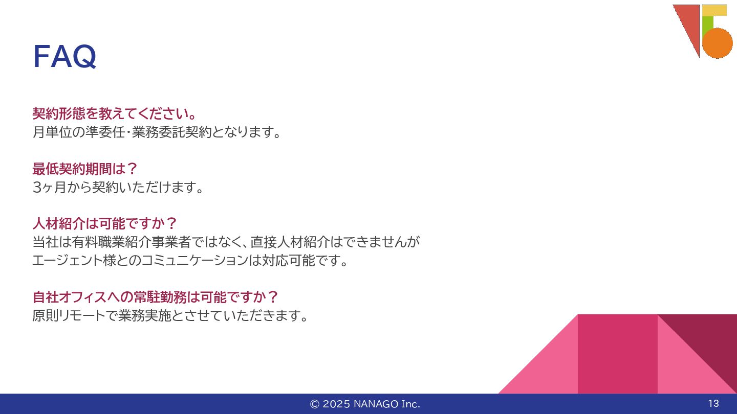 © 2025 NANAGO Inc. FAQ 契約形態を教えてください。 月単位の準委任・業務委託契約となります。 最低契約期間は? 3ヶ月から契約いただけます。 人材紹介は可能ですか?