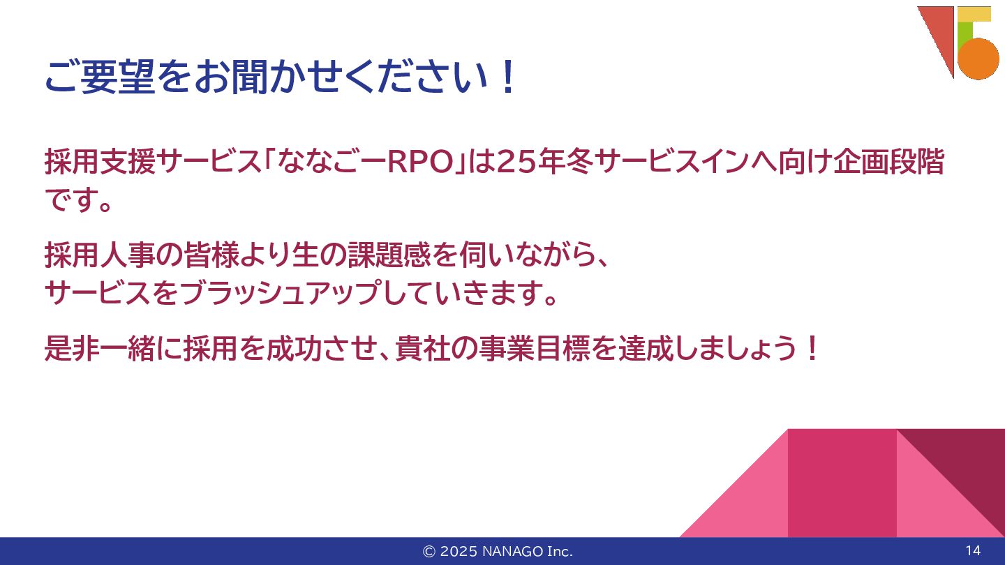 © 2025 NANAGO Inc. ご要望をお聞かせください! 採用支援サービス「ななごーRPO」は25年冬サービスインへ向け企画段階 です。 採用人事の皆様より生の課題感を伺いながら、 サービスをブラッシュアップしていきます。 是非一緒に採用を成功させ、貴社の事業目標を達成しましょう!
