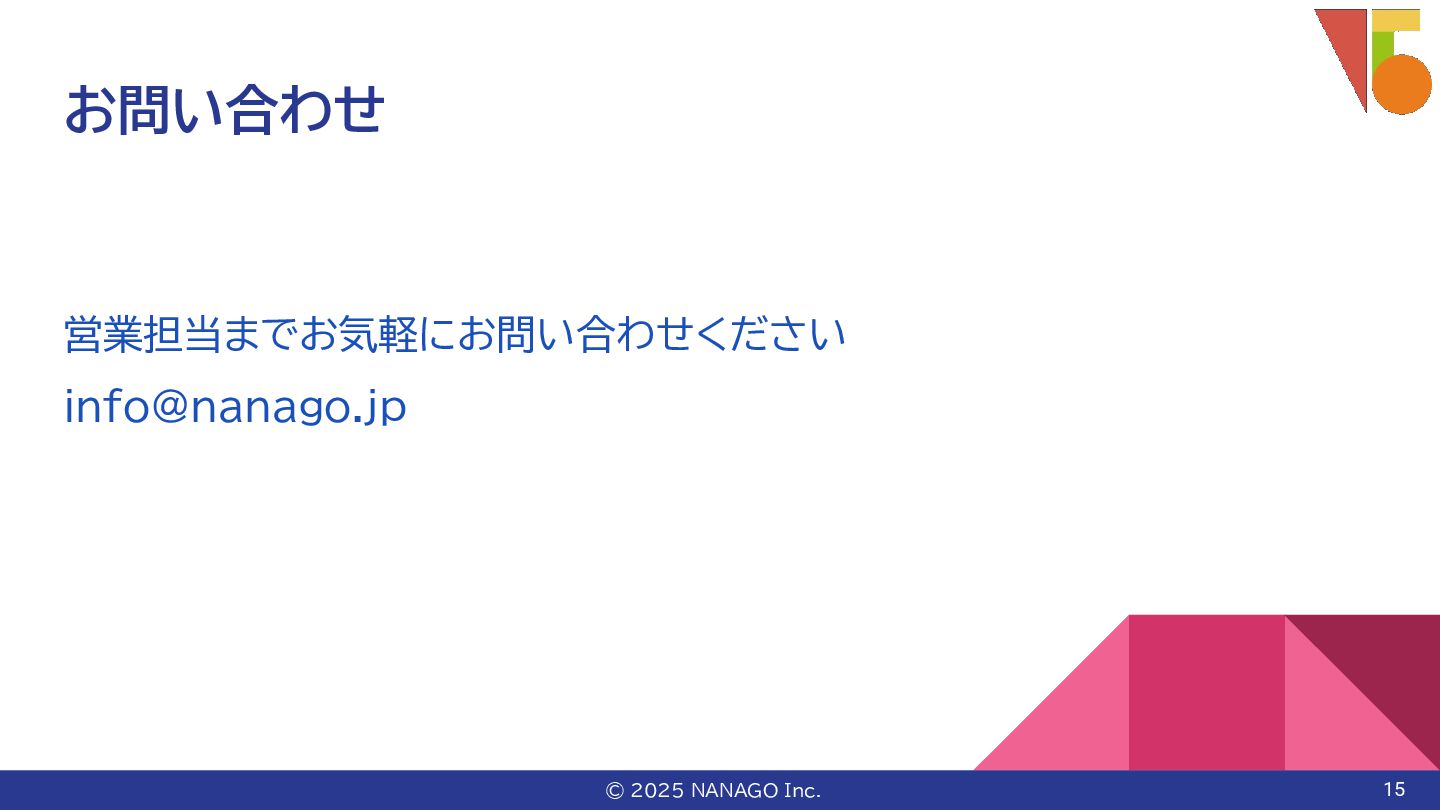 © 2025 NANAGO Inc. お問い合わせ 営業担当までお気軽にお問い合わせください