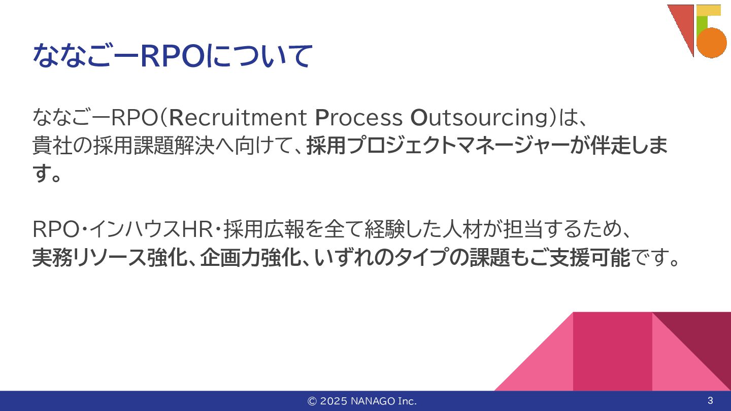 © 2025 NANAGO Inc. ななごーRPOについて ななごーRPO(Recruitment Process Outsourcing)は、 貴社の採用課題解決へ向けて、採用プロジェクトマネージャーが伴走しま す。