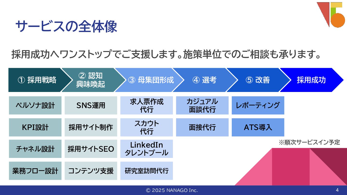 © 2025 NANAGO Inc. 採用成功 サービスの全体像 ※順次サービスイン予定 4 ⑤ 改善