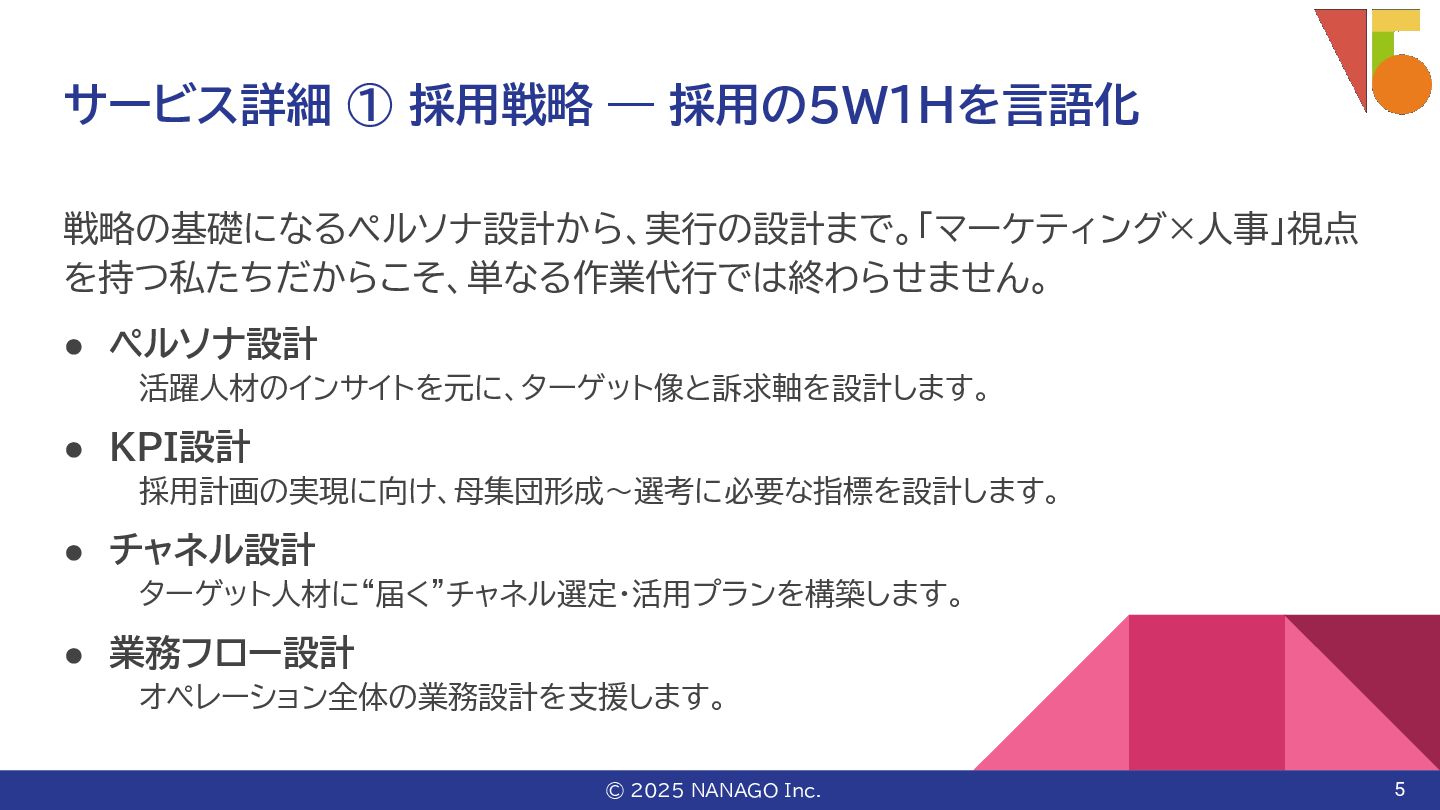 © 2025 NANAGO Inc. サービス詳細 ① 採用戦略 ― 採用の5W1Hを言語化 戦略の基礎になるペルソナ設計から、実行の設計まで。「マーケティング×人事」視点