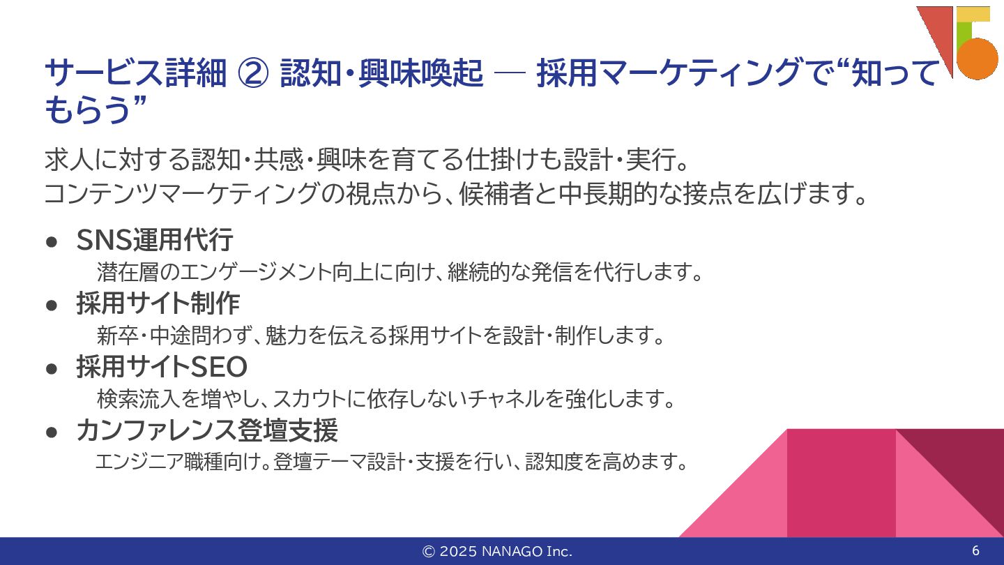 © 2025 NANAGO Inc. サービス詳細 ② 認知・興味喚起 ― 採用マーケティングで“知って もらう”