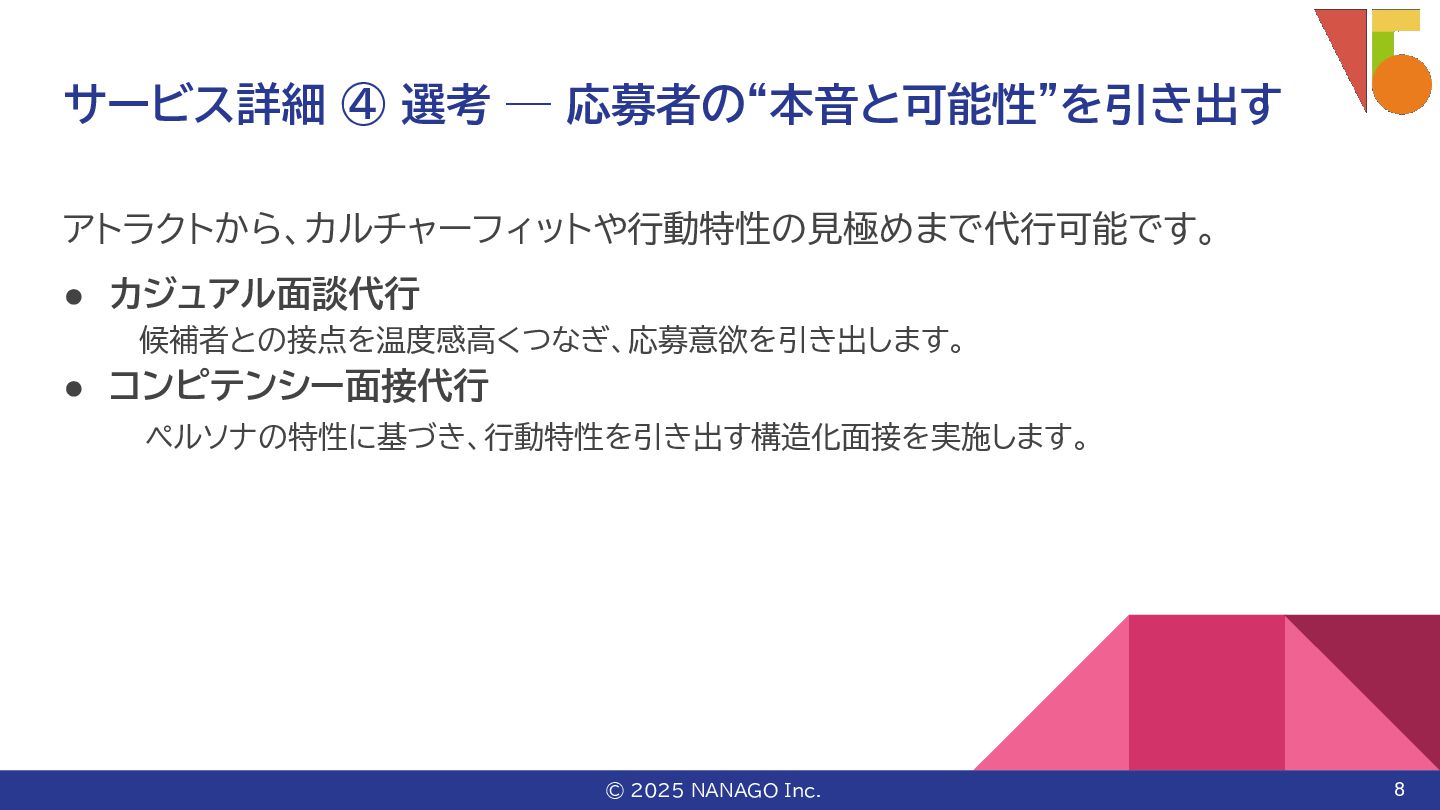 © 2025 NANAGO Inc. サービス詳細 ④ 選考 ― 応募者の“本音と可能性”を引き出す アトラクトから、カルチャーフィットや行動特性の見極めまで代行可能です。