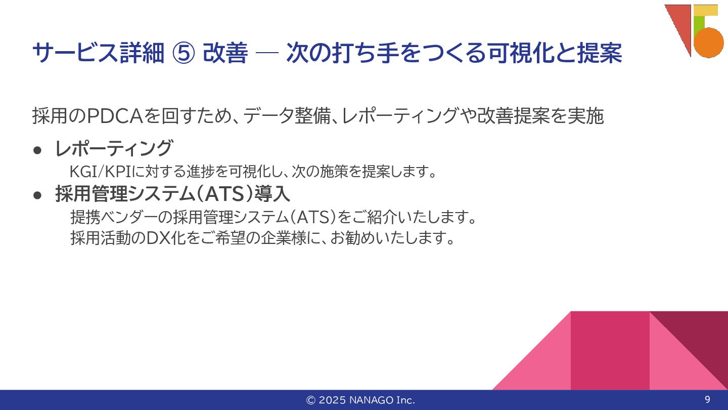 © 2025 NANAGO Inc. サービス詳細 ⑤ 改善 ― 次の打ち手をつくる可視化と提案 採用のPDCAを回すため、データ整備、レポーティングや改善提案を実施