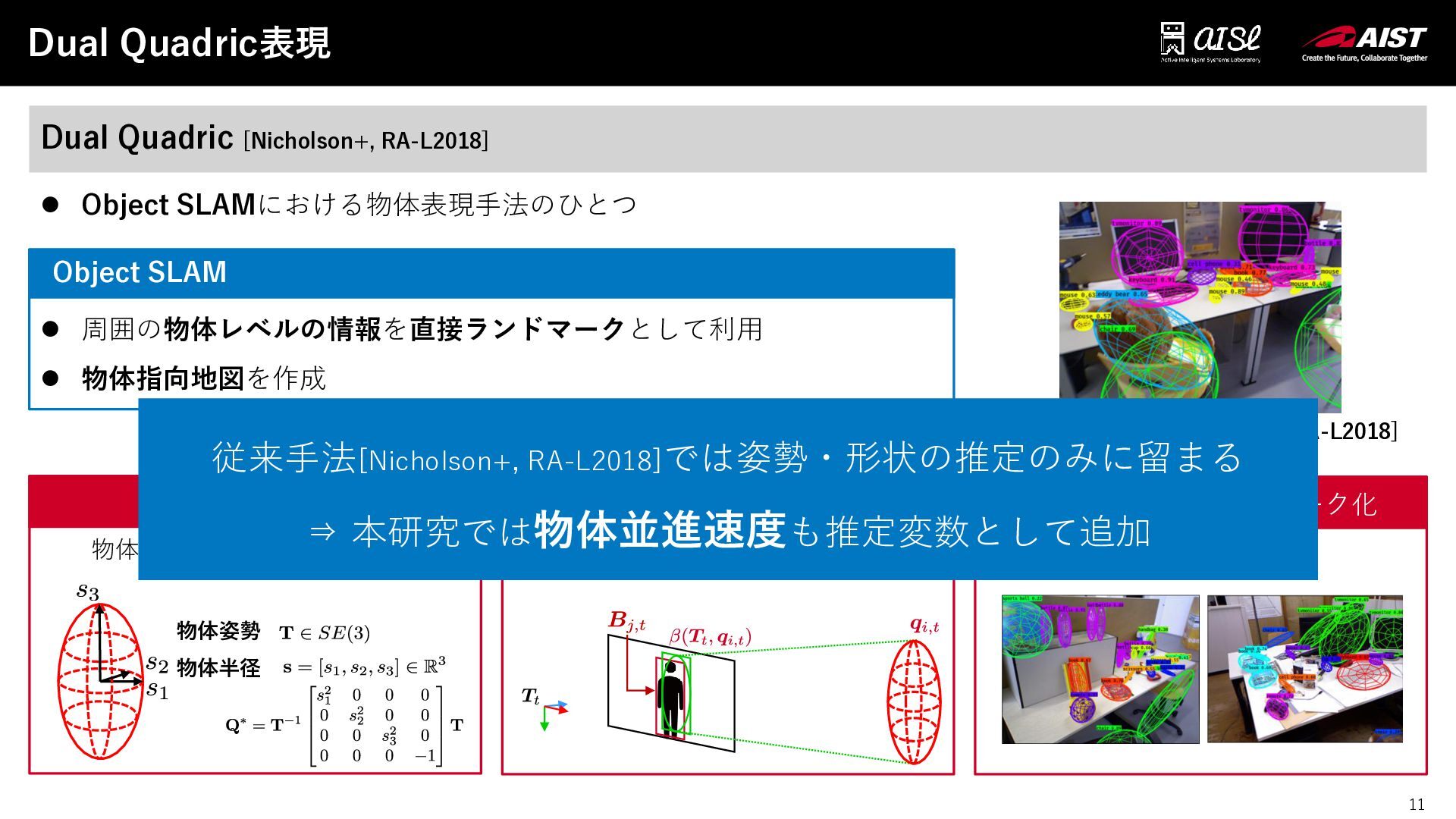 SLAMにおける物体表現手法のひとつ QuadricSLAM [Nicholson+, RA-L2018] 物体姿勢 物体半径 Dual Quadric ファクタグラフ最適化との相性 ◦ 任意物体のランドマーク化 Object SLAM ⚫ 周囲の物体レベルの情報を直接ランドマークとして利用 ⚫ 物体指向地図を作成 検出結果と物体間を滑らかに制約 物体を3次元楕円体として近似 従来手法[Nicholson+, RA-L2018]では姿勢・形状の推定のみに留まる ⇒ 本研究では物体並進速度も推定変数として追加