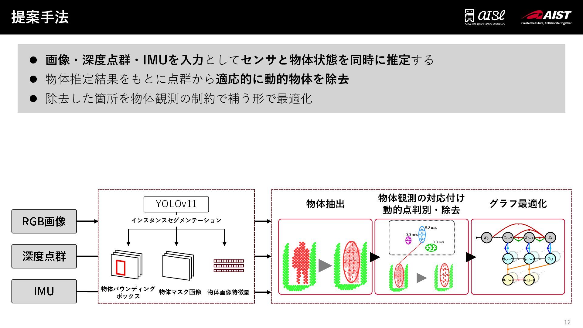 12 提案手法 12 RGB画像 深度点群 IMU YOLOv11 物体マスク画像 物体画像特徴量 物体バウンディング