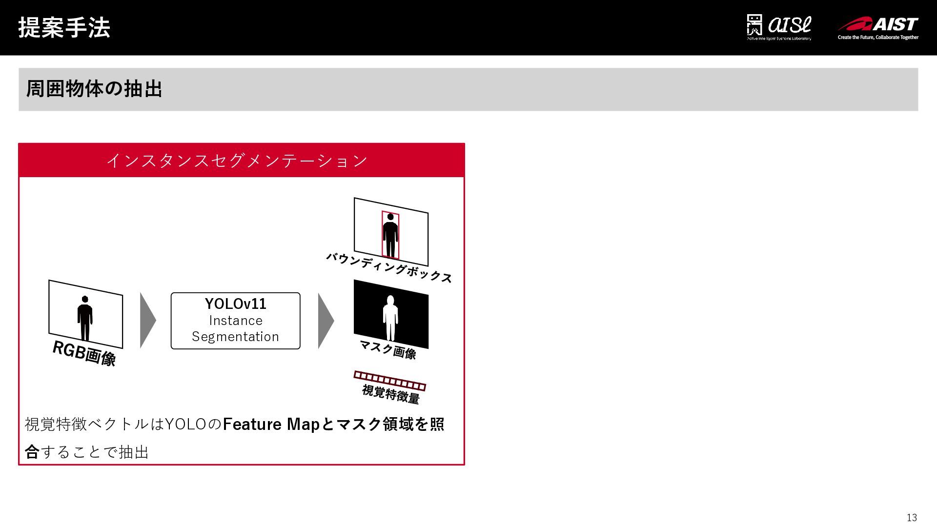 13 提案手法 13 周囲物体の抽出 YOLOv11 Instance Segmentation インスタンスセグメンテーション 視覚特徴ベクトルはYOLOのFeature Mapとマスク領域を照