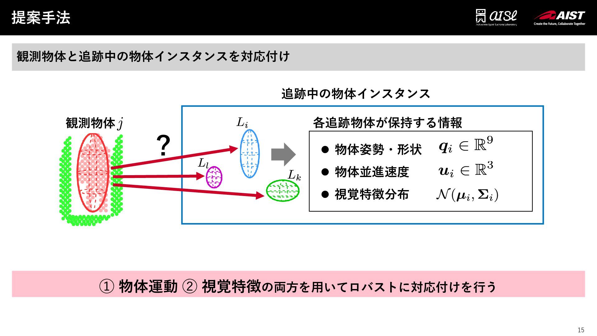 物体姿勢・形状 ⚫ 物体並進速度 ⚫ 視覚特徴分布 各追跡物体が保持する情報 観測物体 ?