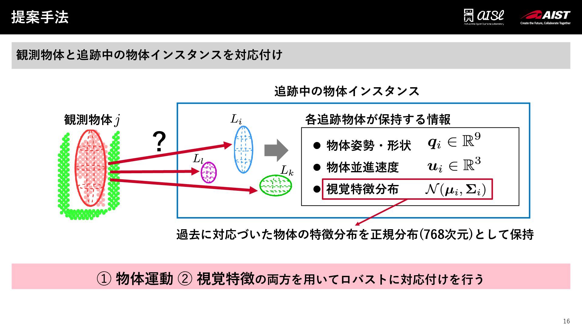 15 提案手法 15 観測物体と追跡中の物体インスタンスを対応付け ➀ 物体運動 ➁ 視覚特徴の両方を用いてロバストに対応付けを行う 追跡中の物体インスタンス ⚫
