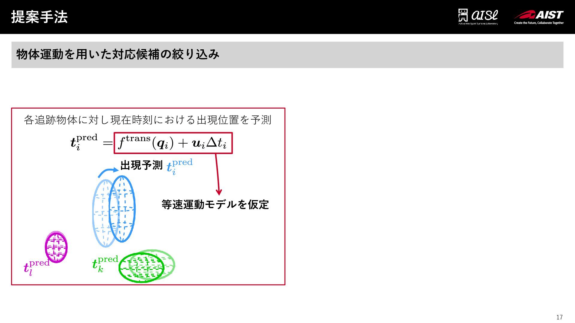 16 提案手法 16 観測物体と追跡中の物体インスタンスを対応付け ➀ 物体運動 ➁ 視覚特徴の両方を用いてロバストに対応付けを行う 追跡中の物体インスタンス ⚫