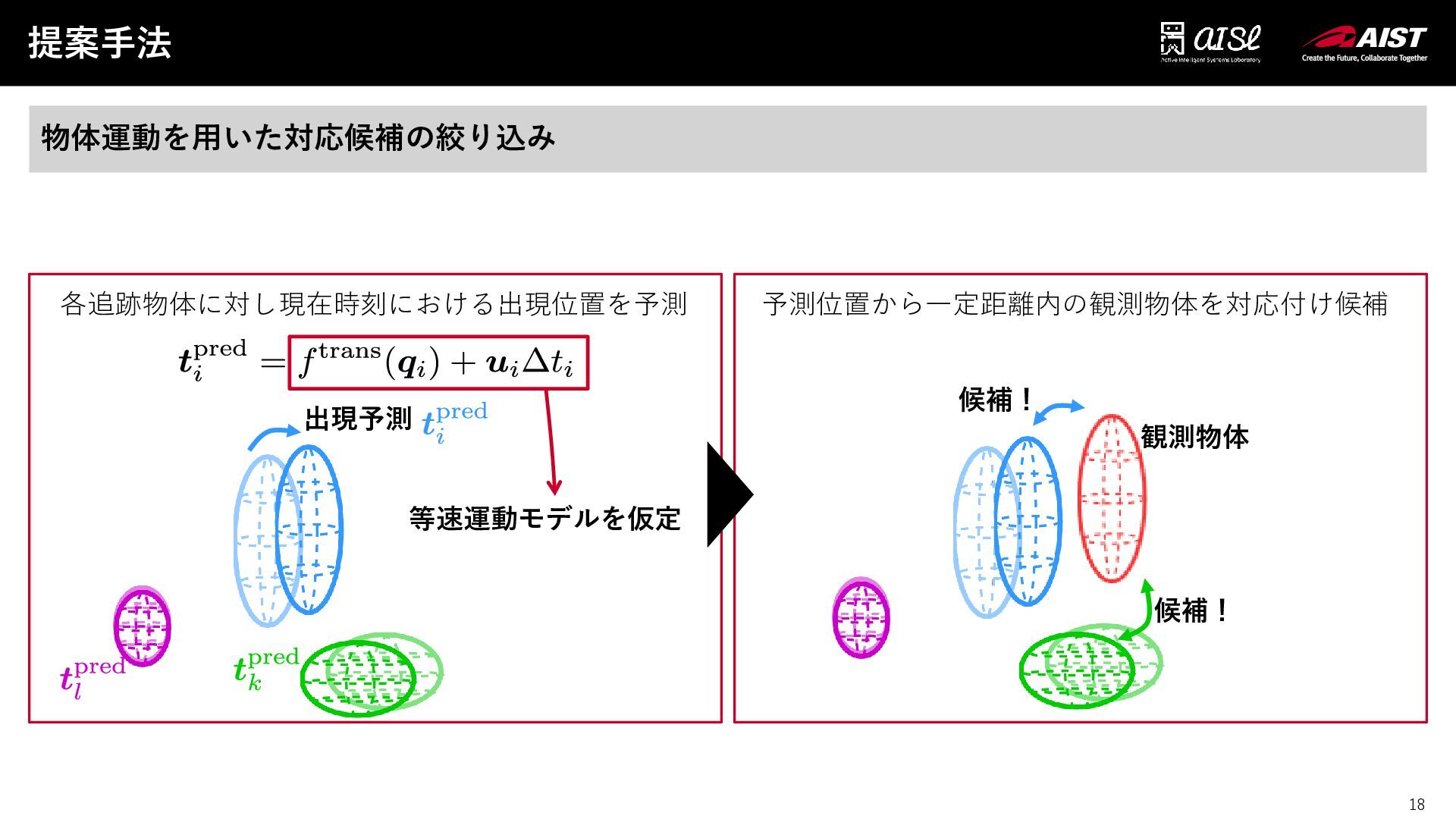 17 提案手法 17 物体運動を用いた対応候補の絞り込み 出現予測 各追跡物体に対し現在時刻における出現位置を予測 等速運動モデルを仮定