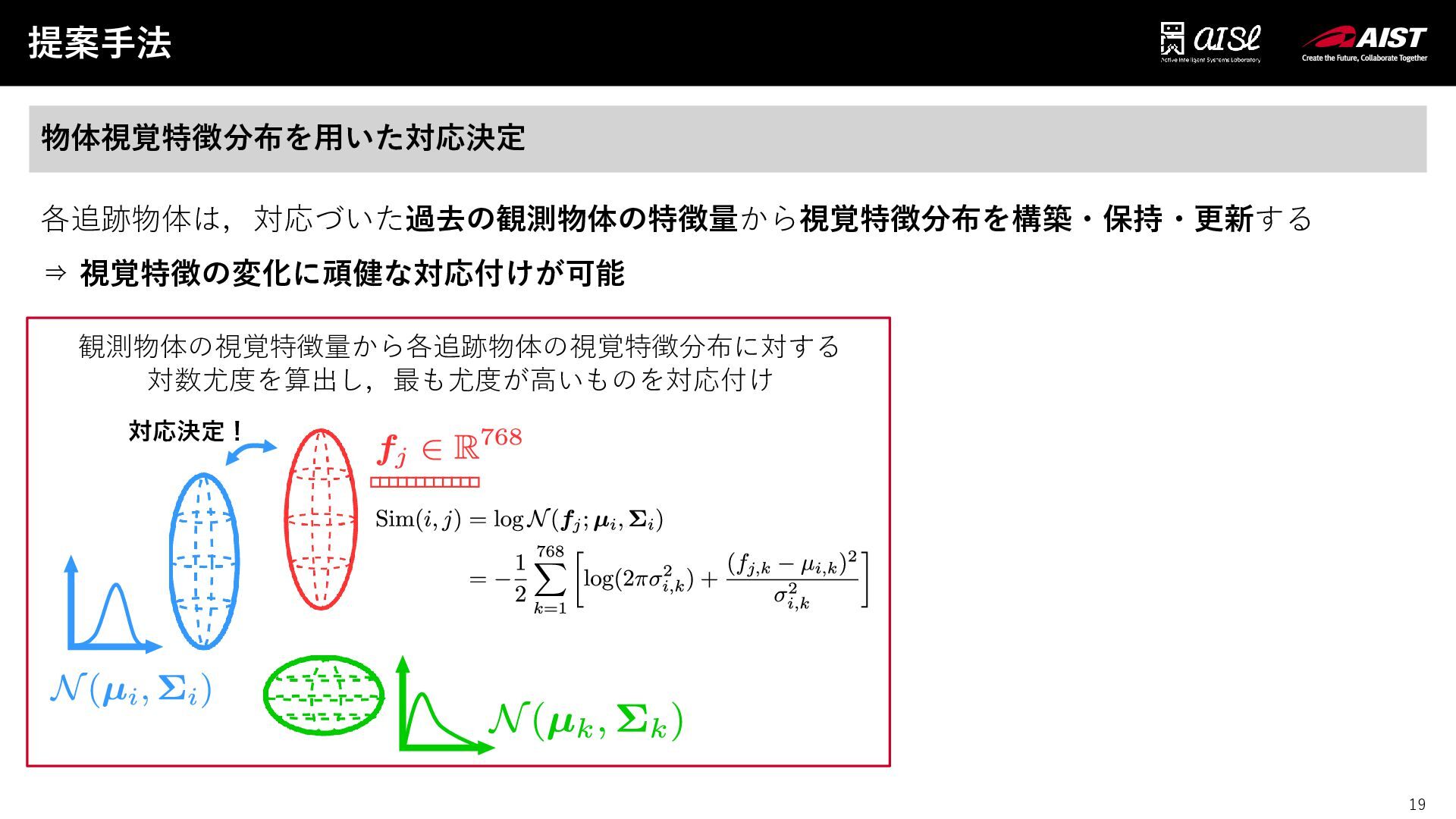 視覚特徴分布の更新 逐次更新アルゴリズム[B. P. Welford+, 1962] を適用することで分布の更新を行う ⇒ 過去の全特徴量を保持せずコスト小 物体視覚特徴分布を用いた対応決定 各追跡物体は,対応づいた過去の観測物体の特徴量から視覚特徴分布を構築・保持・更新する ⇒ 視覚特徴の変化に頑健な対応付けが可能